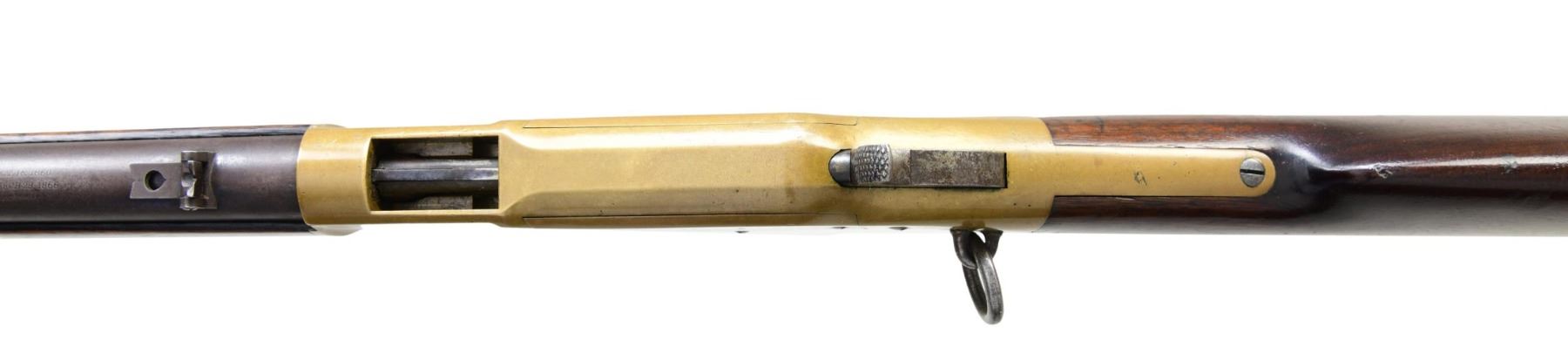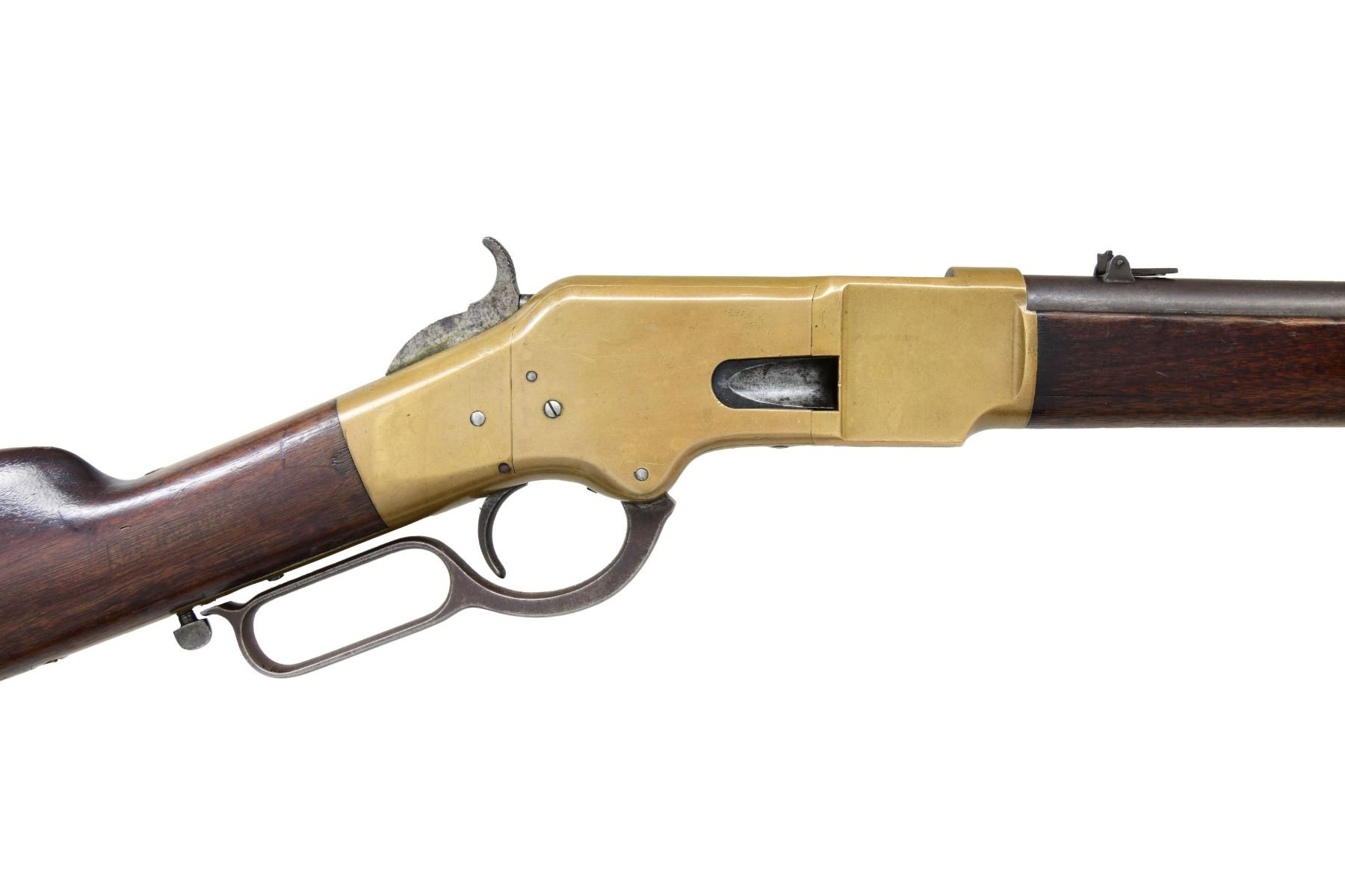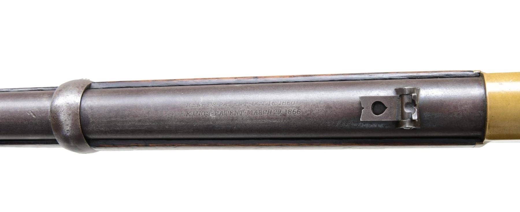 RING CARBINE. Cal. 44 HRF. S#. 15842, found on left inside tang. Bbl. 20" carbine style has Henry & King's patent markings. Mag band mounted front sight w/ carbine leaf rear sight. Full length mag. Brass action gas staple mounted saddle ring on left side. Band fastened carbine forend & straight grip stock w/ brass crescent trapdoor buttplate. Mfg. 1868. UNATTACHED ACCESORIES: 3 piece cleaninf g rod held in stock compartment., CONDITION: Metal has faded to a mottled gray. Brass shows a pleasing mild patina w/ illegible added marking on left side plate. Wood has added finish over handling marks. Sound action. Lightly pitted bore has lightly worn rifling. (01-25889/DS). ANTIQUE. $5000-8000
