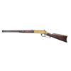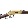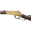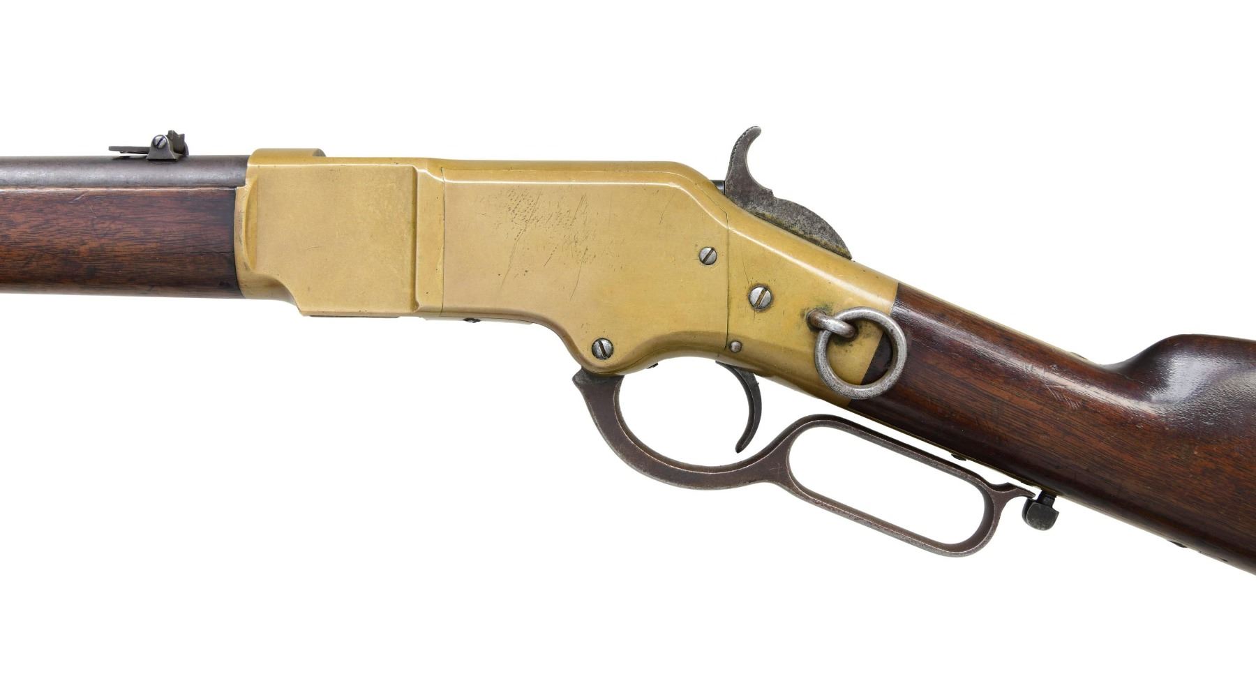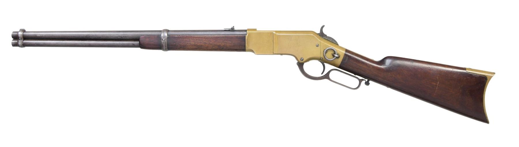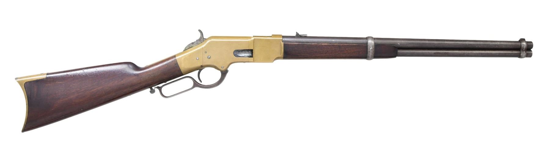 RING CARBINE. Cal. 44 HRF. S#. 15842, found on left inside tang. Bbl. 20" carbine style has Henry & King's patent markings. Mag band mounted front sight w/ carbine leaf rear sight. Full length mag. Brass action gas staple mounted saddle ring on left side. Band fastened carbine forend & straight grip stock w/ brass crescent trapdoor buttplate. Mfg. 1868. UNATTACHED ACCESORIES: 3 piece cleaninf g rod held in stock compartment., CONDITION: Metal has faded to a mottled gray. Brass shows a pleasing mild patina w/ illegible added marking on left side plate. Wood has added finish over handling marks. Sound action. Lightly pitted bore has lightly worn rifling. (01-25889/DS). ANTIQUE. $5000-8000