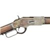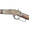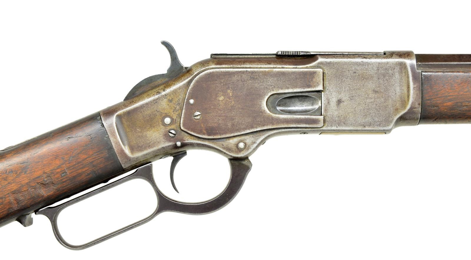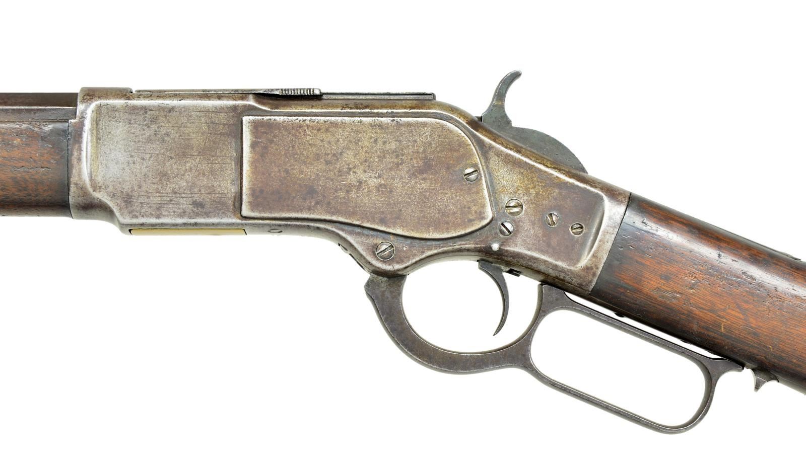 Cal. 44 WCF (44-40). S# 76459. Bbl. 30" oct., 6" longer than standard. Sporting sights. Full length mag. Walnut forearm & straight grip stock w/ crescent steel buttplate. S# indicates 1881 mfg. CONDITION: metal has faded gray/brown appearance w/ spots of light pitting. Wood has dark worn appearance w/ dents, sm. chips & handling marks. Good mechanics. Bore has darkened appearance w/ sound rifling showing light pitting. (01-20432/DS). ANTIQUE. $1,500-2,000.