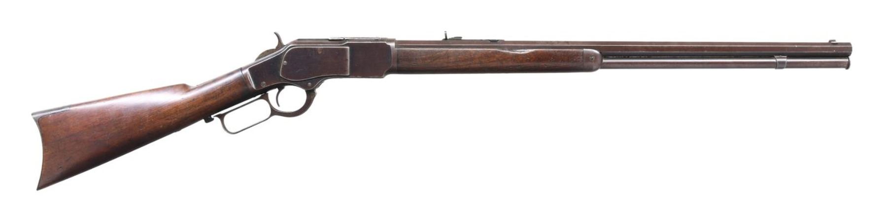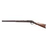 RIFLE. Cal. 22 Long. S# 321103B. Bbl. 24" octagon. Sporting sights. Full length mag. Walnut forearm & straight grip stock w/ crescent steel buttplate. Mfg. 1889. CONDITION: metal finish has faded to an even brown showing small spots of corrosion. Wood has worn finish showing scratches, marks & small dents. Stock has a chip along lower tang & poor fit at receiver & top tang. Right side of forearm has a large chip. Dark pitted bore w/ partially intact rifling. PROVENANCE: From the lifelong collection of Jerry Senter. (01-24855/DS). ANTIQUE. $2,500-3,500.