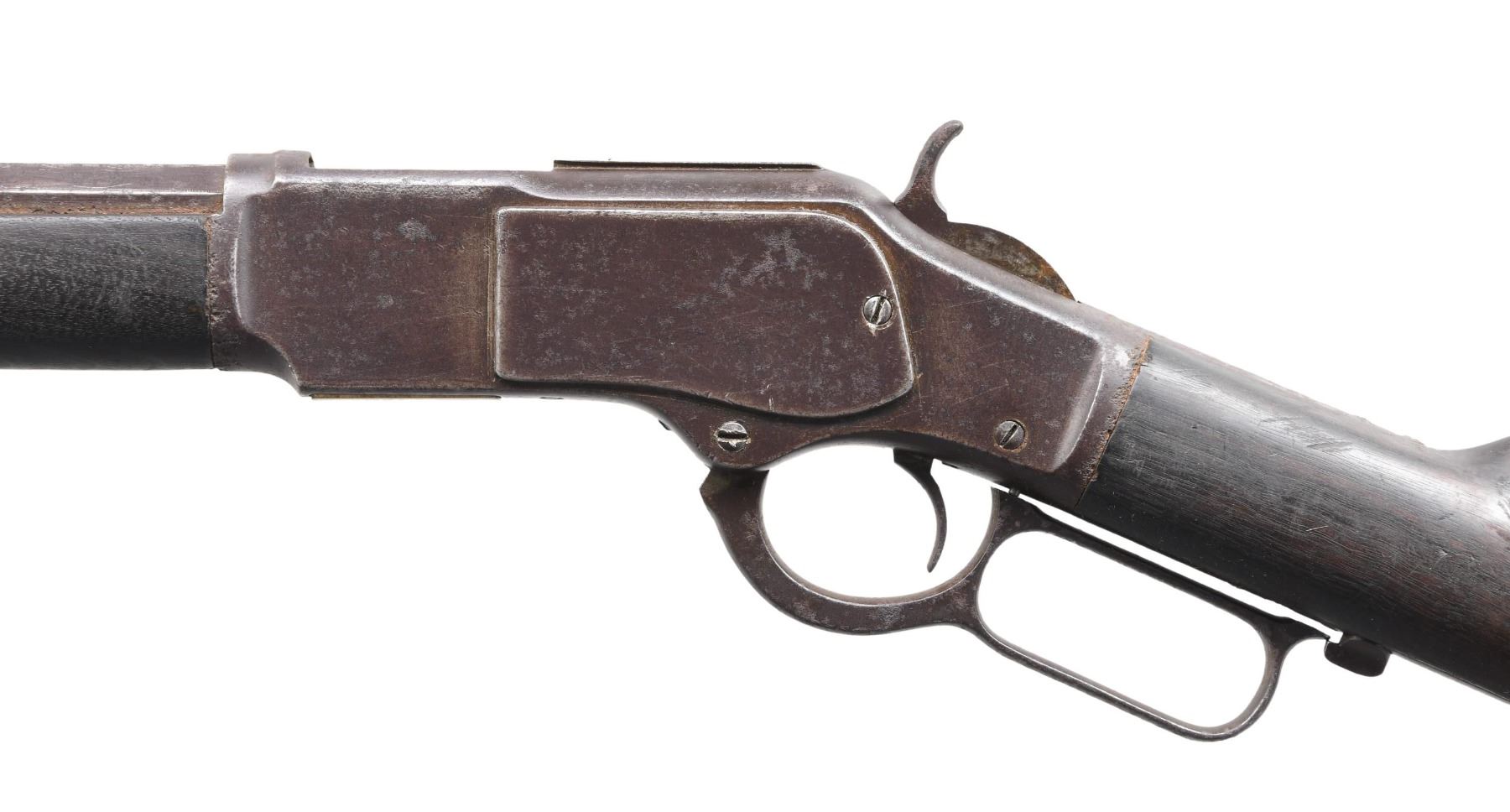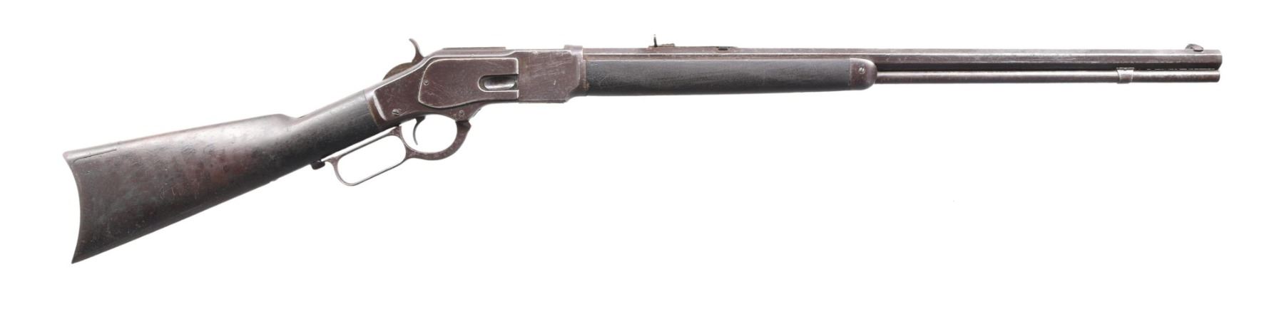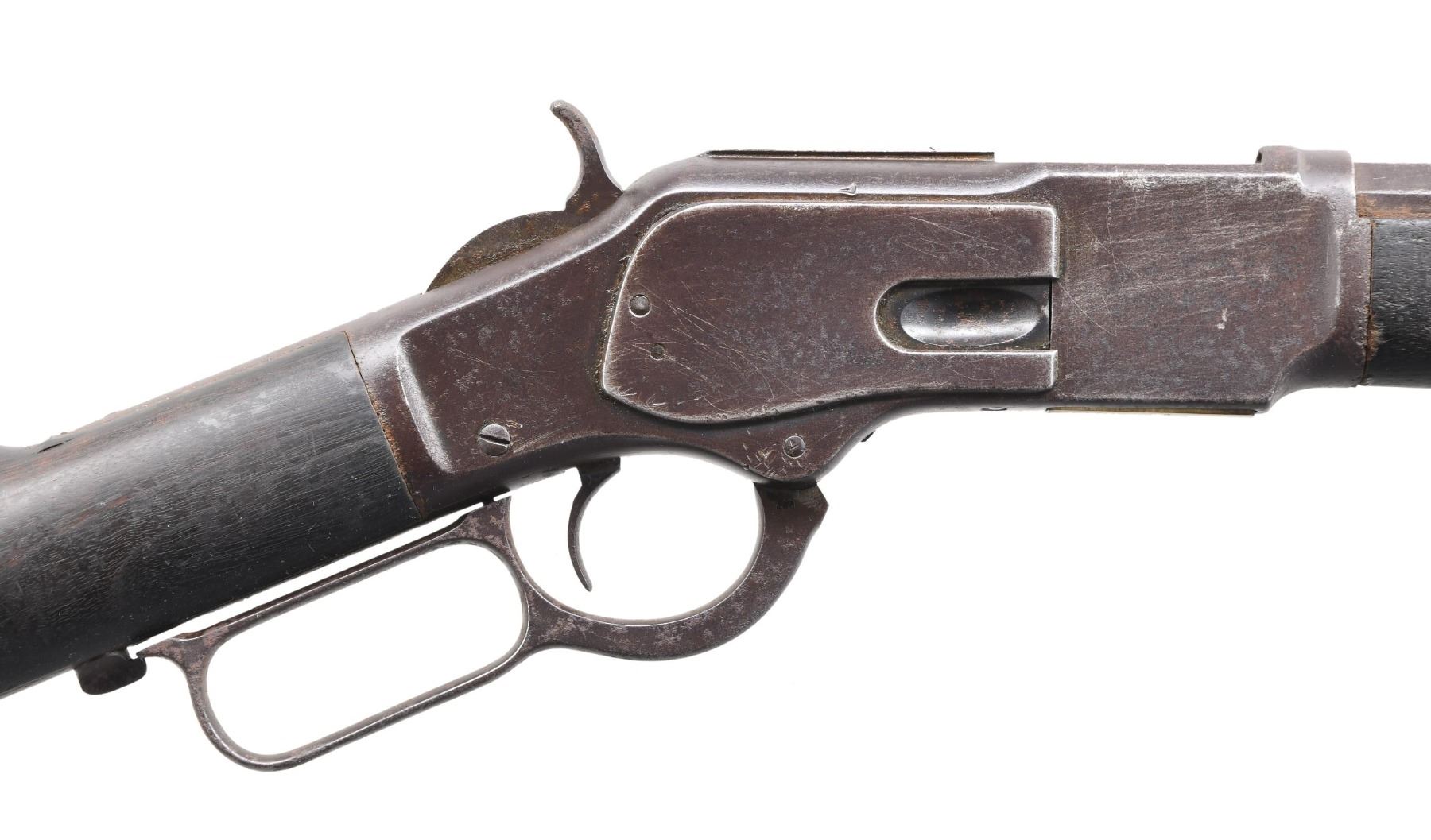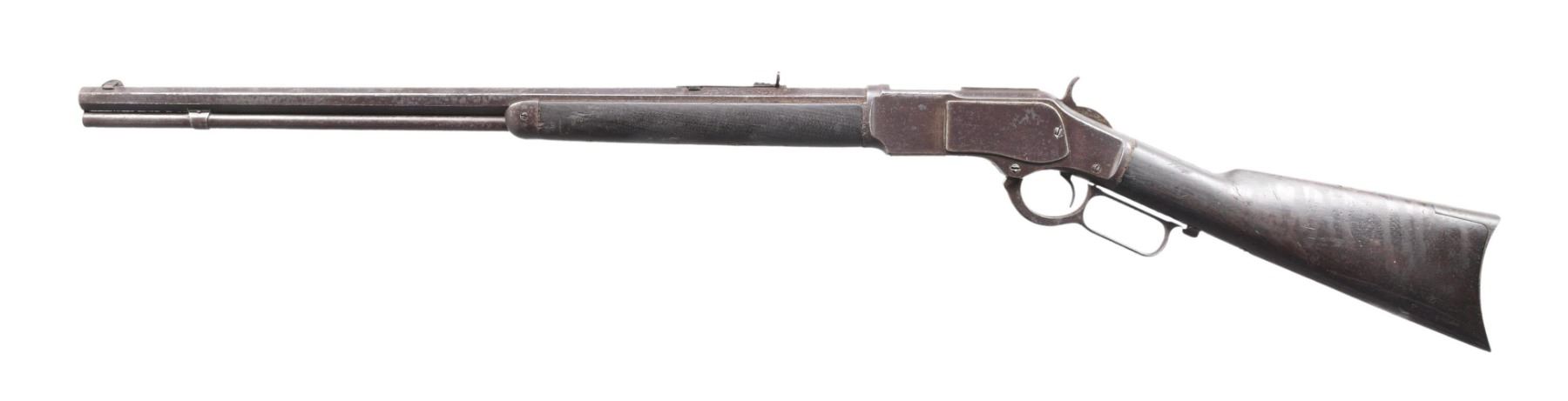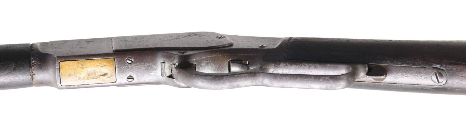 Cal. 32 WCF. SN. 334426B. Bbl. 24" octagon. German silver blade front sight w/ original sporting rear sight. Full length mag. Walnut forearm & straight grip stock w/ crescent steel buttplate. Mfg. 1890. CONDITION: Metal has a brown appearance with scattered surface corrosion. Bottom of brass carrier is dented. Age darkened wood shows scratches & marks with dents & gouges. Functioning action, lever hangs loose. Dust cover is removed. Dark deeply pitted bore retains partially intact rifling. (01-25465/DS). ANTIQUE. $1200-1800.