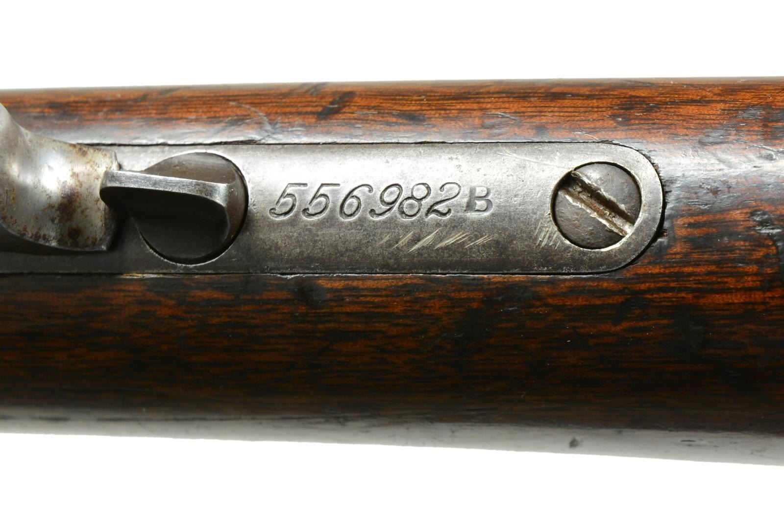 ACTION RIFLE. Cal. 38 W.C.F. S# 556982B. Bbl. 26" oct., 2" longer than standard. Combination front sight, sporting rear sight & combination tang sight. Single set trigger. Blue finish. Walnut forearm & straight grip stock w/ crescent steel trapdoor buttplate. UNATTACHED ACCESSORIES: 4-piece cleaning rod stored in stock. Cody Firearms Museum letter stating the following information "Rifle / 38 caliber / Octagon barrel / Set trigger / Received in the warehouse on September 13, 1901 / Shipped from warehouse on September 14, 1901 With 1 other arm to order number 108732". CONDITION: bbl. retains 50% dull fading blue showing edge wear. Action & mag. tube have blue gray coloration from touch up finish. Stocks have worn finish showing dents, scratches & handling marks. Sound mechanics. Bore has worn rifling showing sm. spots of very light pitting. (20-1777). CURIO. $2,500-3,500.