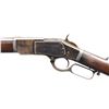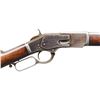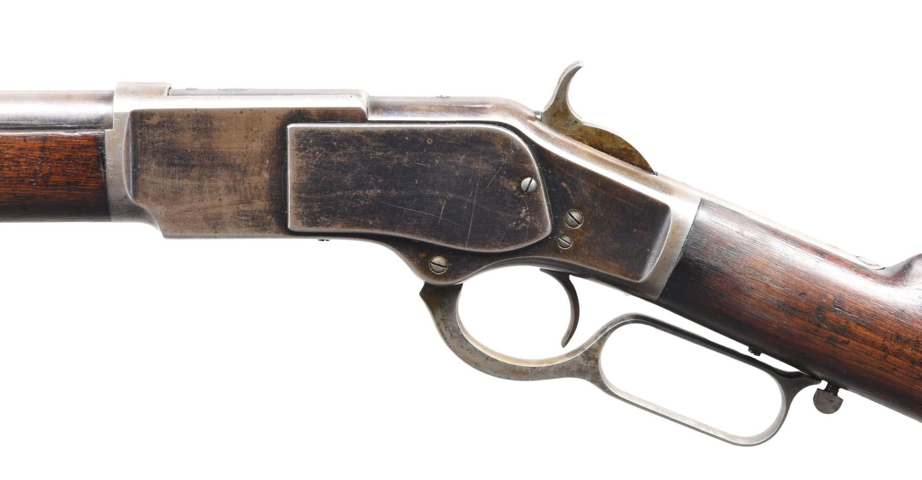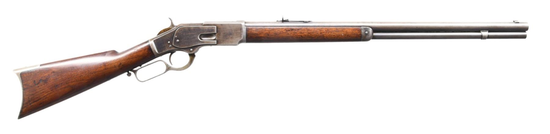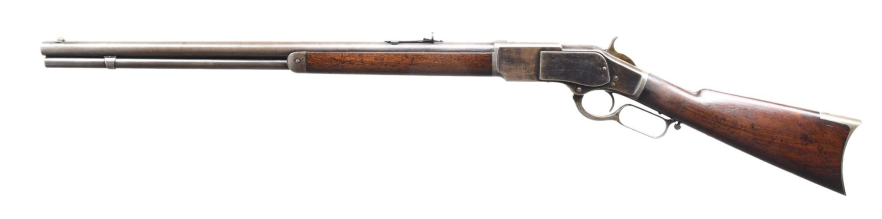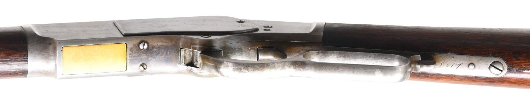 Cal. 44 WCF. S# 8517. Bbl. 24" round w/ sporting sights. Action features a mortised checkered oval thumb-print dust cover. Blue finished w/ case colored hammer & lever. Full length mag. Walnut forearm & straight grip stock w/ crescent steel trapdoor buttplate. UNATTACHED ACCESSORIES: 4 piece ramrod in stock compartment. Also includes a copy of a letter from the Cody Firearms Museum detailing the following information, "Type: Rifle / Barrel Type: Round / Trigger: Plain / Received in warehouse on September 16, 1875 / Shipped from warehouse on October 25, 1875, Order number 4542". CONDITION: action retains over 40% dull fading blue showing scratches & marks. Bbl. & mag. tube blue have largely faded to gray. Hammer & lever case coloring has faded to silvery gray. Refinished wood shows numerous scratches, marks & small dents. Sound mechanics. Bore retains good rifling showing some very light pitting. (01-25626/DS). ANTIQUE. $5,500-7,500.