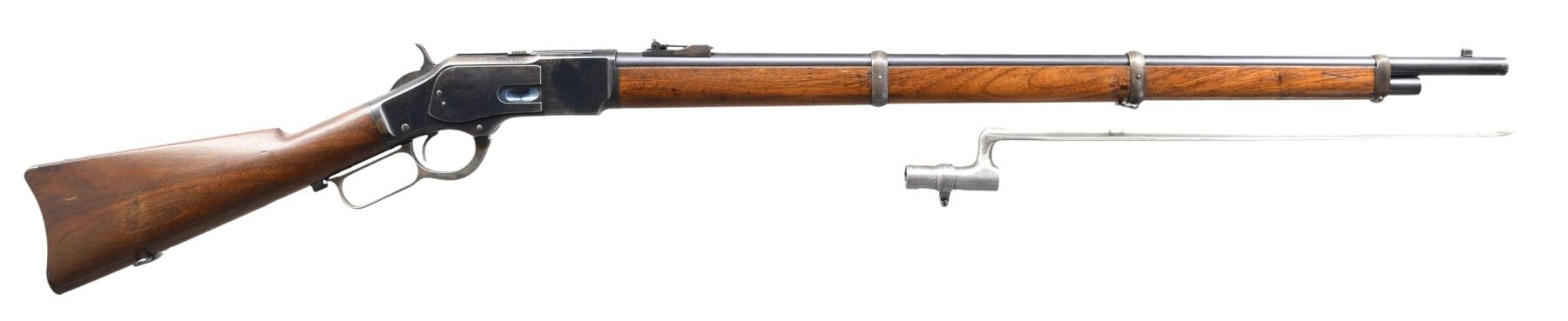 Cal. 44 WCF. S# 571259B. Bbl. 30". Fixed front sight w/ musket leaf rear sight. Blue finish w/ case colored hammer & lever. 2 band fastened musket forend & straight grip walnut stock w/ steel trapdoor musket buttplate. UNATTACHED ACCESORIES: unmarked triangular bayonet. CONDITION: Very good, retaining over 80% original blue showing spots of wear w/ flaking on receiver & forend bands. Hammer & lever retain 90% dull lightly faded case colors. Stock finish shows handling marks w/ an area of touchup on right side. Bright near excellent bore. Bayonet is cleaned. (24-5767/DS). CURIO. $2500-3500.