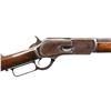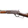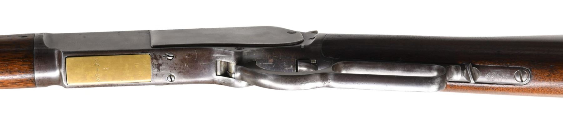 Cal. 45-75. S# 57530. Bbl. 28" octagon. Sporting front sight w/ graduated leaf rear sight. Full length mag. Blue finished w/ case colored hammer & lever. Walnut forearm & straight grip stock w/ crescent steel buttplate. Mfg. 1885. CONDITION: metal retains 25% dull fading blue showing carry wear w/ areas of cleaning. Refinished stock & forearm show scratches, marks & small dents. Lightly pitted bore retains intact rifling. (24-5315/DS). ANTIQUE. $3,500-4500.