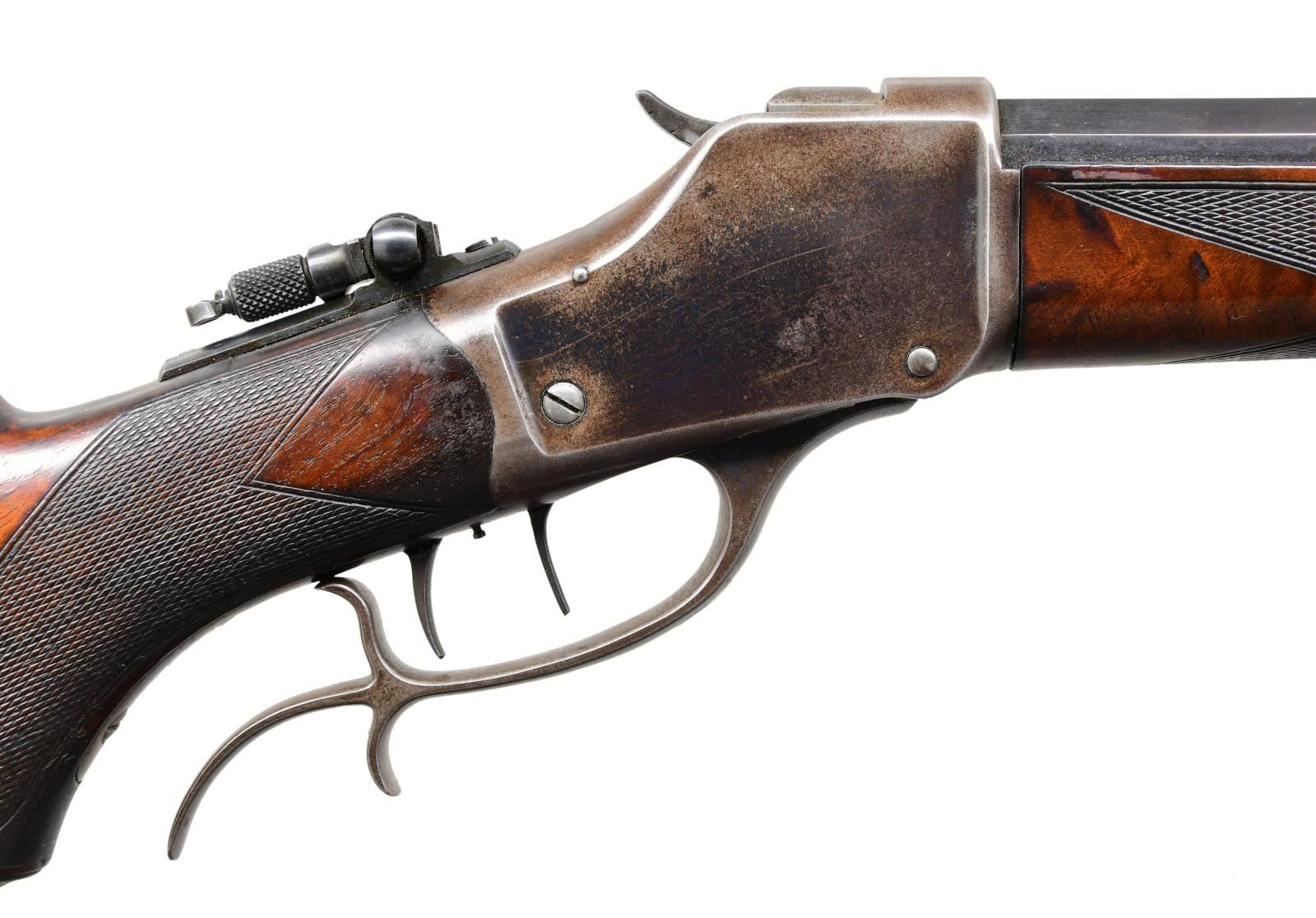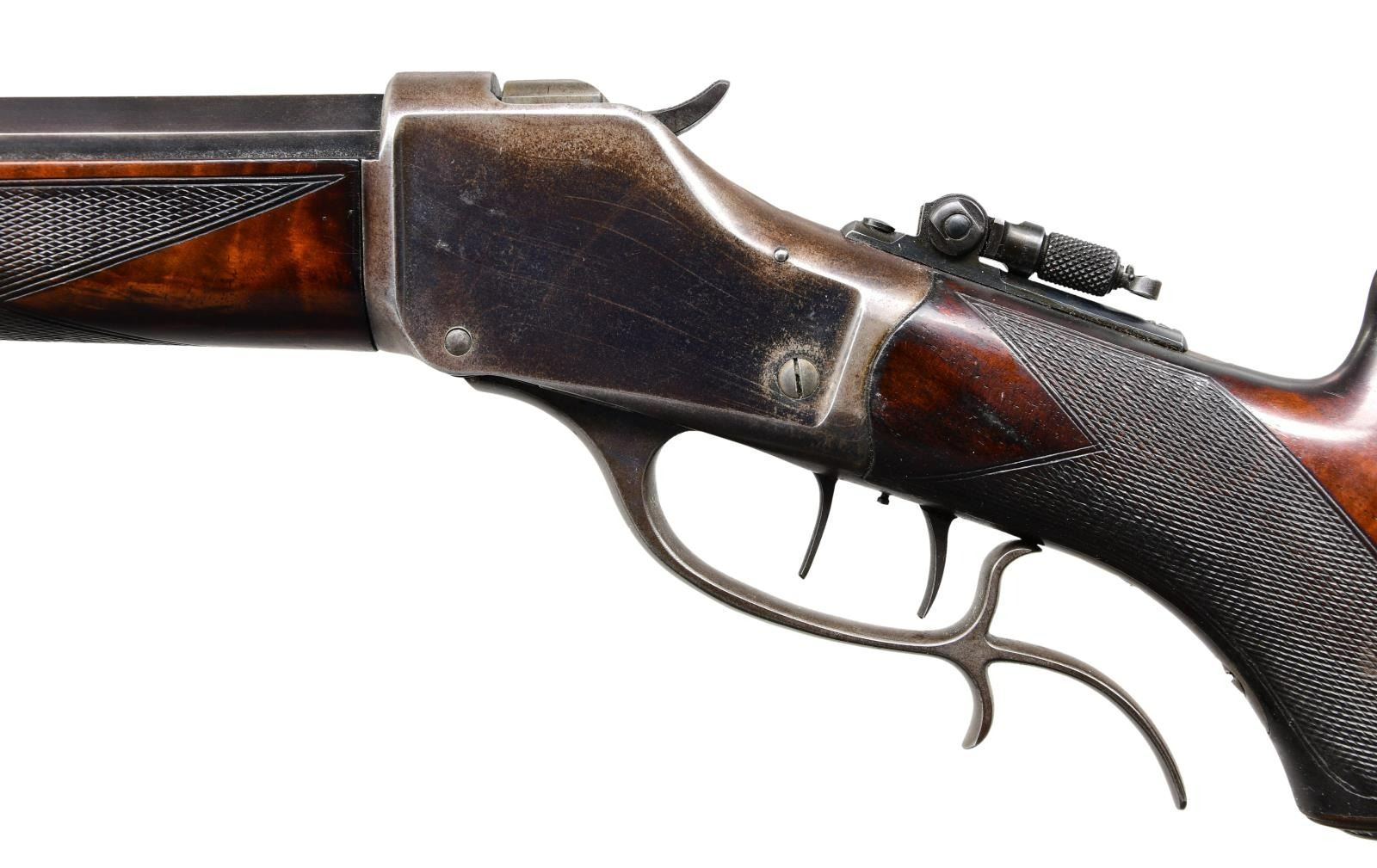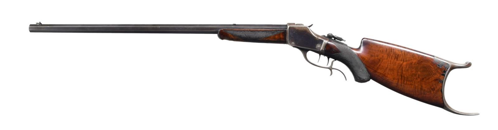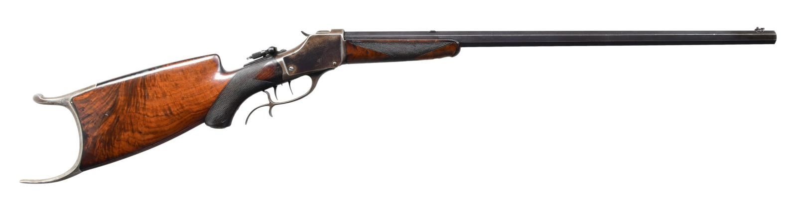 SHOT RIFLE. Cal. 38-55. S# 86197. Bbl. 26" no. 2 wt. octagon. Combination front sight, filler in rear dovetail w/ tang sight. Double set triggers and standard Schuetzen lever. Blue and case colored finish. Schnabel tipped forearm with ebony insert and hard rubber capped Schuetzen style stock of "XX" fancy black walnut. Style H factory checkering and steel Swiss buttplate. Right inside of lower tang is marked with assembly no. "9057" followed by wood grade "XX" and "HS". Last two assembly numbers are visible in top tang channel of the stock. UNATTACHED ACCESSORIES: a Cody Firearms Record Check - Serial number applied on April 14,1900. Type: Rifle Caliber: 22 LRF Barrel Type: 1/2 Octagon Barrel Weight: #2 Barrel Length 26 inches. Trigger: Schuetzen Set Checkered stock, Pistol grip Sights: Lyman rear, Cup disc, Lyman combination front Helm buttplate Dutch cheekpiece Spur Lever Received in warehouse on April 19,1900 Shipped from Warehouse on April 25, 1900, Order number 55547 Repair and Return on July 09, 1900, Order number 61683 Repair and Return on July 08, 1902, Order number 143775 Repair and return on September 27, 1906, Order Number 71083. CONDITION: bbl. retains 70% dull slightly faded blue showing edge wear. Action has fading blue on receiver sides with carry areas fading to brown. Original wood finish shows wear with spots of finish loss having scratches and marks. Set trigger is not functioning properly. Bore retains lightly worn rifling. (24-1793/DS). CURIO. $2,500-4,000.