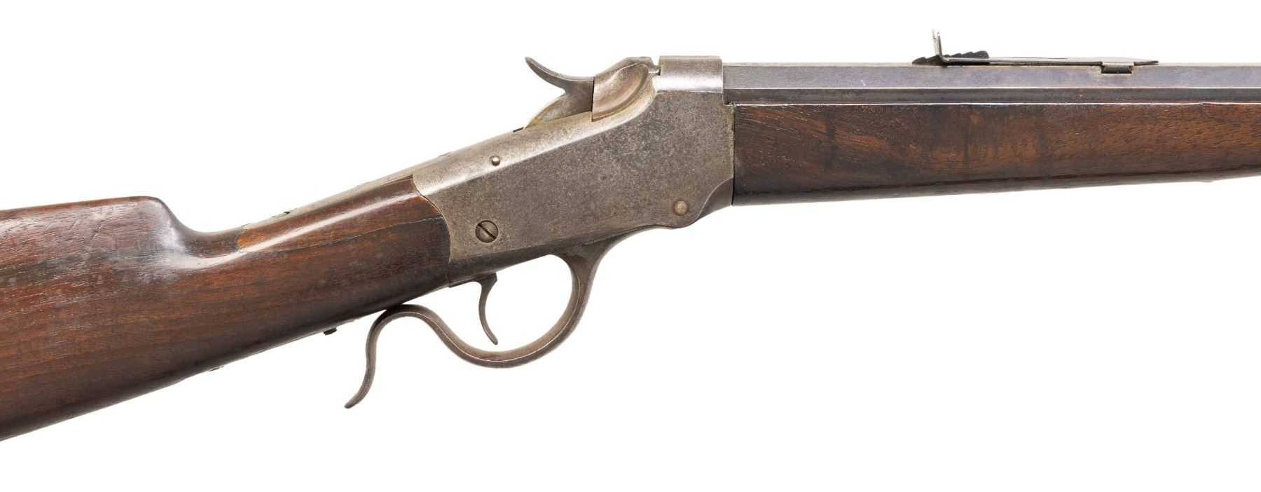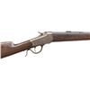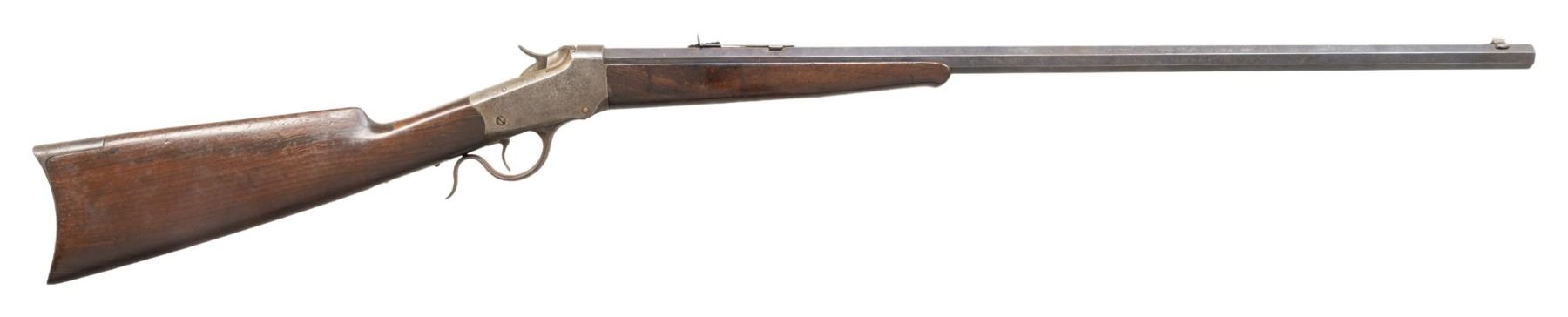 Cal.25-20 Single Shot. S#. 53161. Bbl. 28" No. 1 weight octagon. Sporting front with replacement sporting style rear sight. Ebony tipped Schnabel forend with straight grip walnut stock having a crescent steel buttplate. Mfg. 1891. CONDITION: metal has faded to brown showing spots of light pitting. Refinished wood shows wear and handling marks. The stock a 2 5/8" added wood repair right of the top tang. Sound action. The bore has a darkened appearance retaining sound rifling. (01-26793/DS). ANTIQUE. $500-800.
