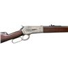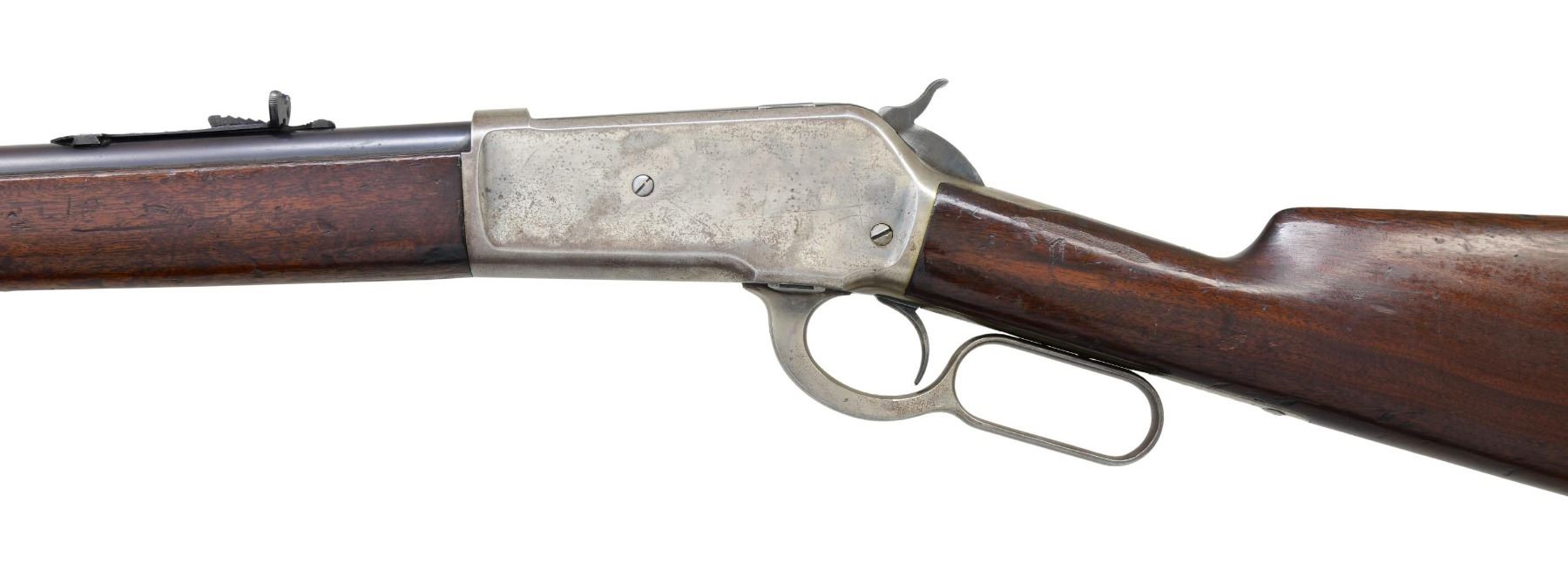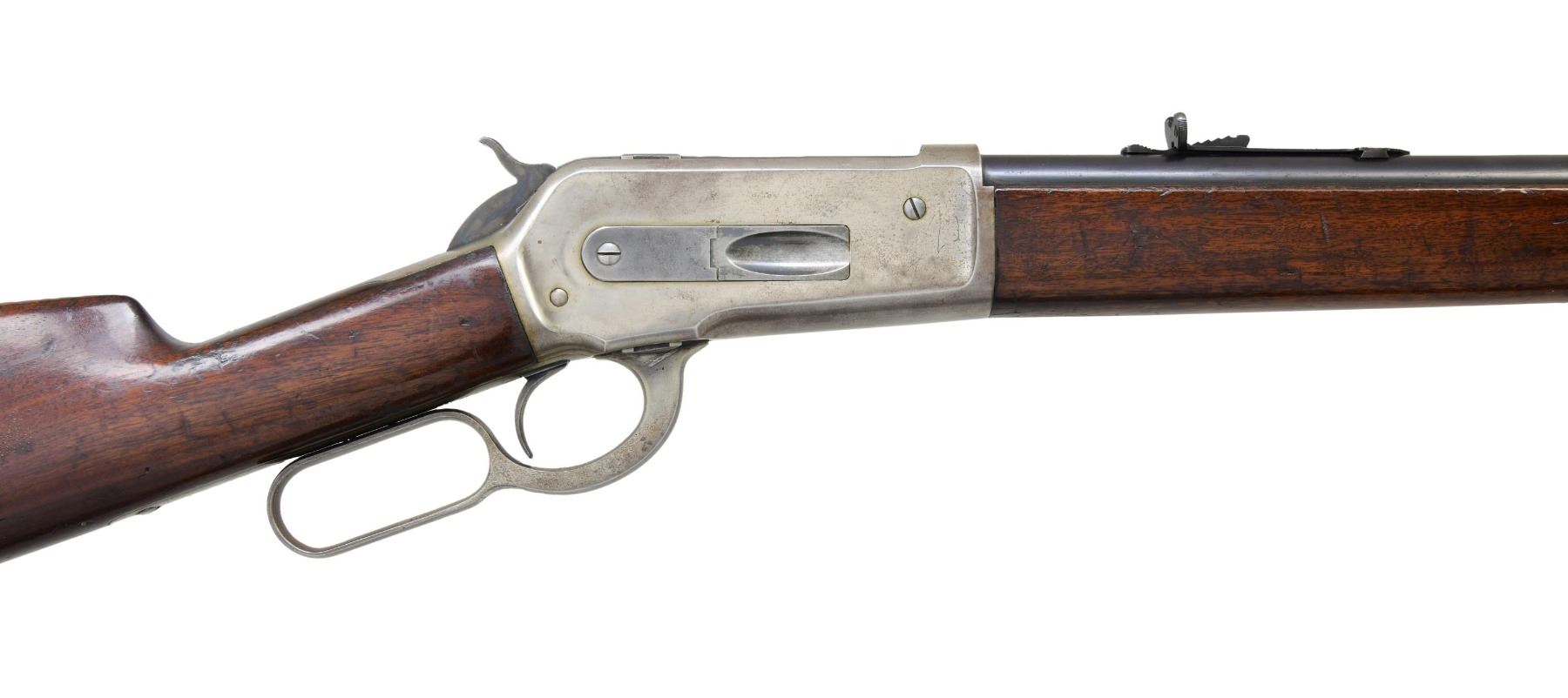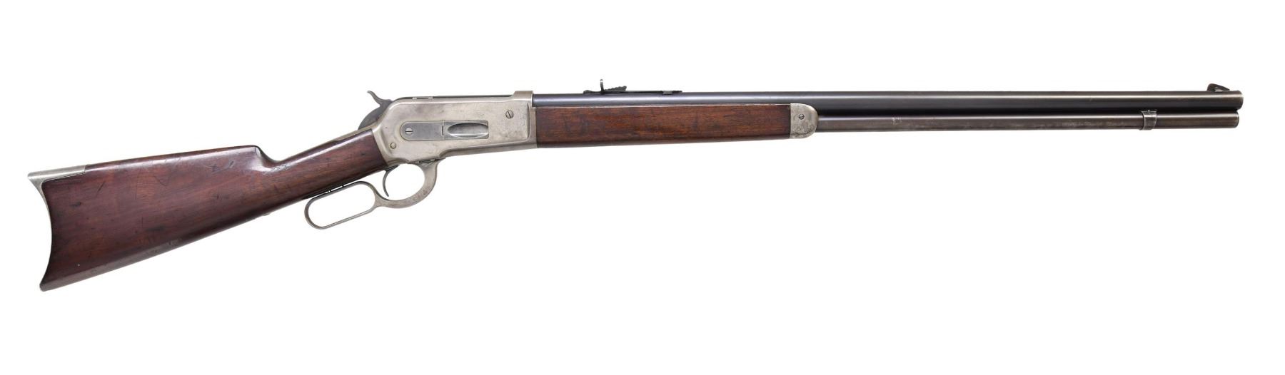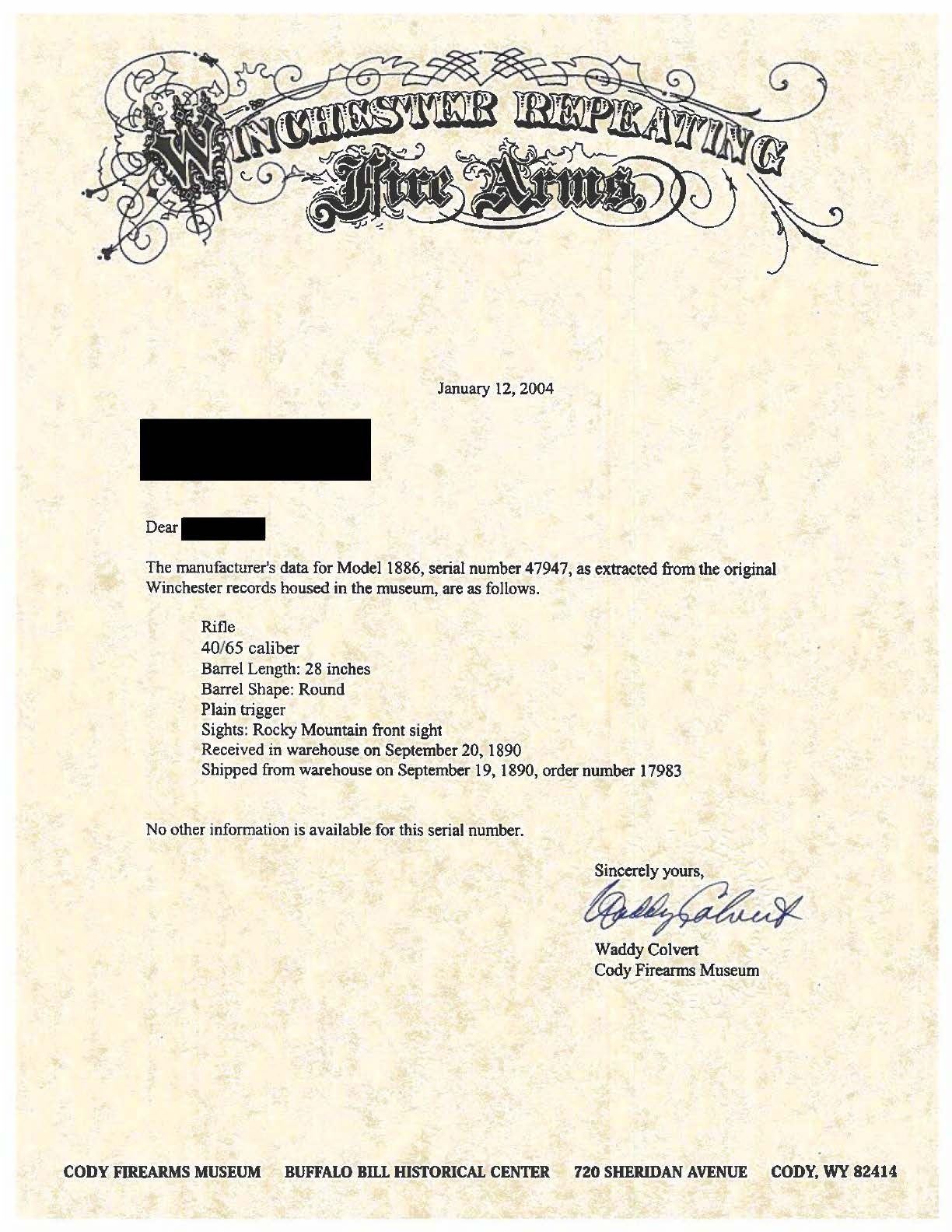 Cal. 40-65 WCF. S#. 47947. bbl. 28" round, 2" longer than standard. Rocky mountain front w/ sporting rear sight. Full length mag. Case colored action, forend cap & crescent steel buttplate. Walnut forend & straight grip stock. UNATTACHEC ACCESSORIES: Cody Firearms Museum letter stating the following: " Rifle / 40-65 caliber / Barrel length: 28 inches / Barrel Shape: Round / Plain trigger / Sights: Rocky Mountain front sight / Received in warehouse on September 20, 1890 / Shipped from warehouse on September 19, order number 17983." CONDITION: Bbl retains over 85% lightly faded blue showing muzzle wear. Mag tube is fading to brown showing wear spots. Action has a small amount of lightly visible case colors fading to silver. Original wood finish shows wear spots w/ dents scratches & marks. Bore is generally bright w/ strong rifling showing spots of light pitting. (01-25893/DS). ANTIQUE. $3000-4500.