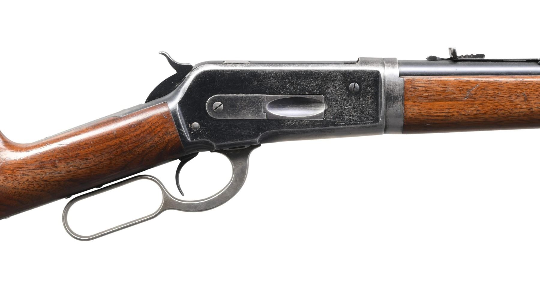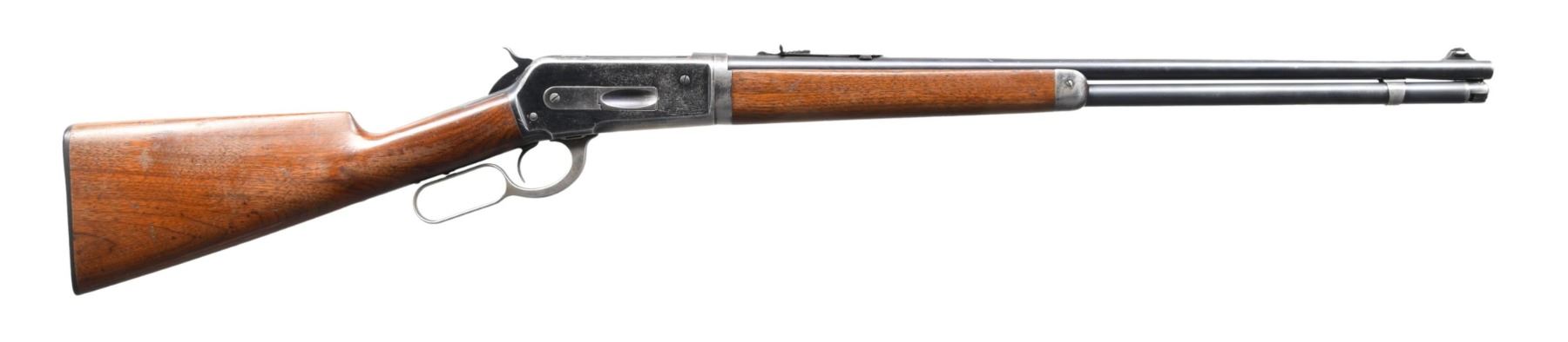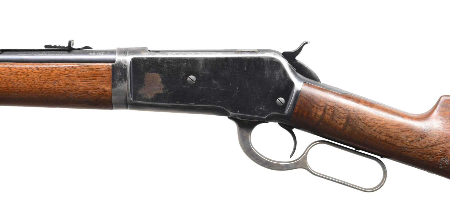 RIFLE. Cal. 33 WCF. S#. 153103. Bbl. 24" round takedown style. Ramp mtd bead front sight w/ flat top sporting rear sight. Full length mag. Blue finish w/ case colored lever. Walnut forend & straight grip stock w/ hard rubber shotgun buttplate. Mfg. 1914. CONDITION: 70% lightly faded blue showing carry wear w/ spots of flaking on action. Stocks show finish wear w/ marks & dents. Very good bore. (24-5694/DS). CURIO. $1500-2200.