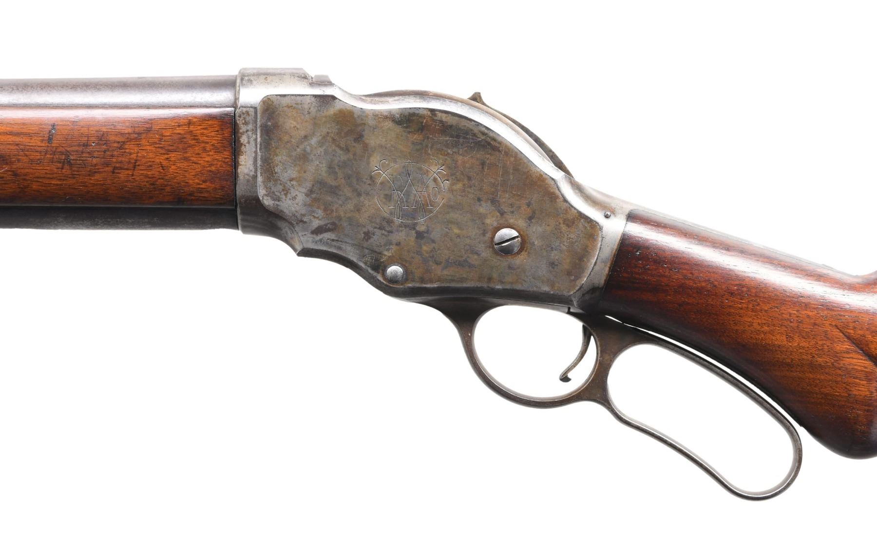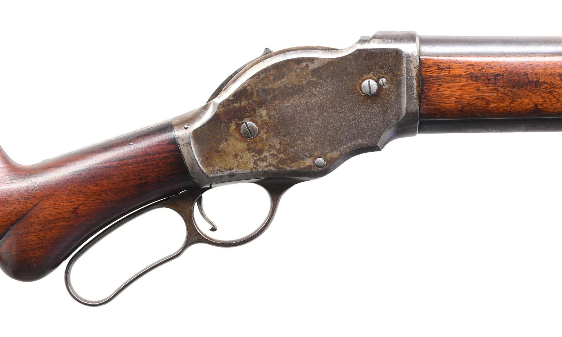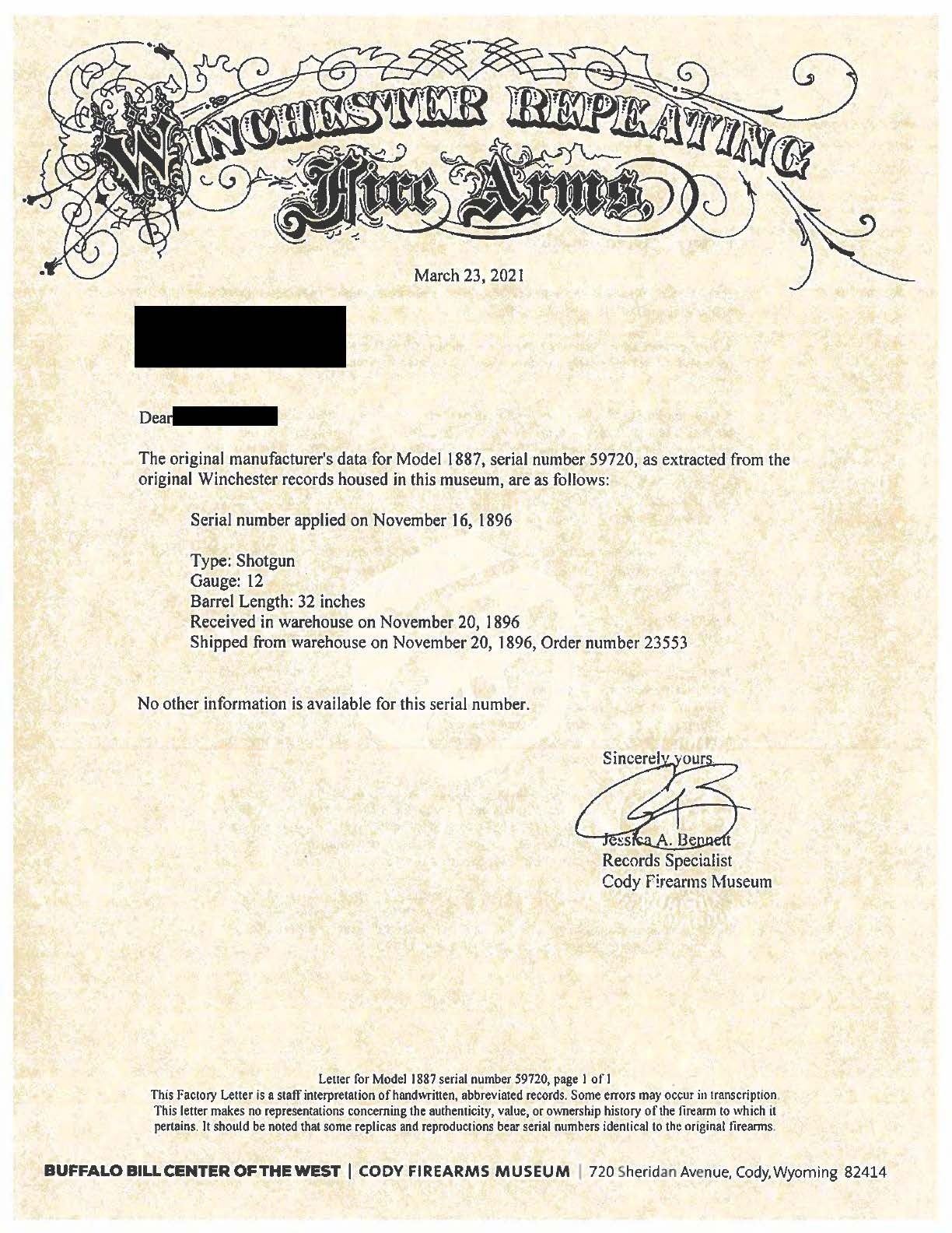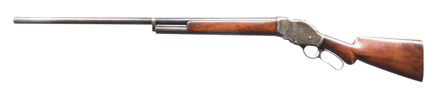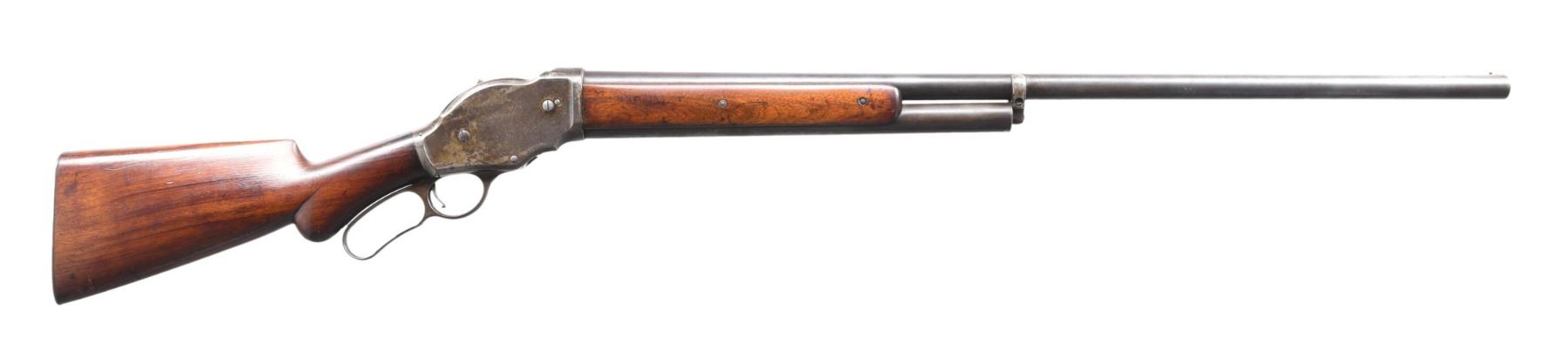 Cal. 12 ga. S# 59720. Bbl. 32" of fluid steel. Full choke (constriction .032). Case colored action w/ WRA marking on left side. Walnut forearm panels & round knob stock w/ checkered steel buttplate. UNATTACHED ACCESSORIES: Cody Firearms Museum letter detailing the following information, "Serial number applied on November 16, 1896 / Type: Shotgun / Gauge: 12 / Barrel Length: 32 inches / Received in warehouse on November 20, 1896 / Shipped from warehouse on November 20, 1896, Order number 23553". CONDITION: left side of receiver shows 30% lightly visible case colors. Other action areas have faded to gray-brown. Bbl. & mag. tube retain 40% dull fading blue. Wood has lightly worn original finish showing scratches, marks & small dents. Sound action. Bore shows some scattered light pitting. (01-25615/DS). ANTIQUE. $900-1,400.