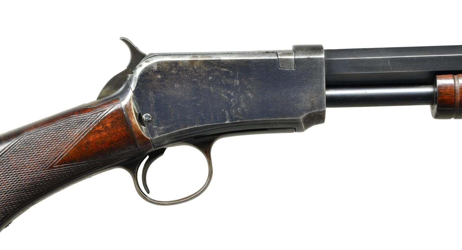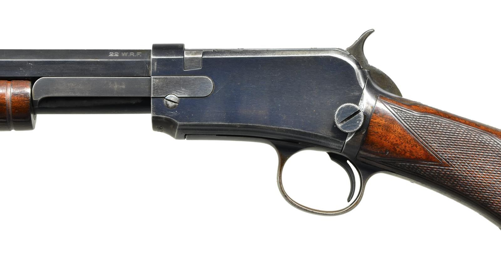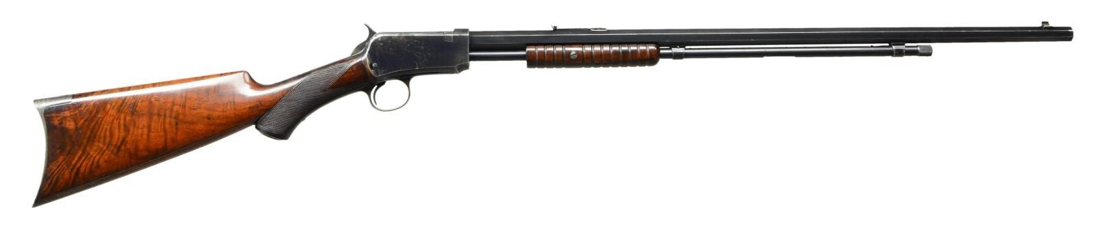 Cal. 22 WRF. S# 390806. Bbl. 24” octagon. Bead front sight w/ square notch screw adj. Sporting rear sight having Jan. 29, 1901 patent date. Tubular mag. Blue finish. Grooved walnut slide handle w/ hard rubber capped pistol grip stock. Fancy X grade black walnut having style H checking & crescent steel buttplate. Left inside of lower tang is marked w/ assembly number “5558” followed by wood grade marking “X” followed by an “F”. S# indicates 1909 mfg. CONDITION: very fine retaining over 80% lightly faded original blue showing edge & carry wear w/ small spots of corrosion. Good wood finish w/ lightly worn checkering having numerous scratches & marks. Very nice bright bore. (23-457/DS). CURIO. $5,000-7,000.
