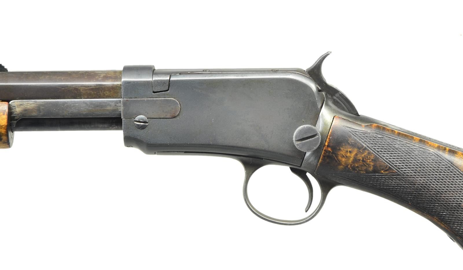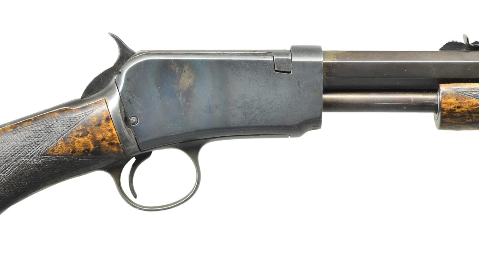 Cal. 22 LR. S# 681705A. Bbl. 24" oct. w/ bead front sight & replacement style sporting rear sight. Bbl. & action have standard "WP" proofs. Tubular mag. Sm. rnd. forearm & pistol grip replacement stock of fancy bird's eye maple have hand checkering, Winchester marked hard rubber grip cap & crescent steel buttplate. 1926 Mfg. CONDITION: refinished bbl. & mag. tube have a brown appearance, refinished action has a dull blue appearance w/ streaks of heat coloring on right side w/ triggerguard assembly fading to gray brown. Stocks have good finish, checkering has dark partially filled appearance. Relined bore has good rifling. (21-4455). CURIO. $500-750.