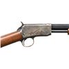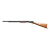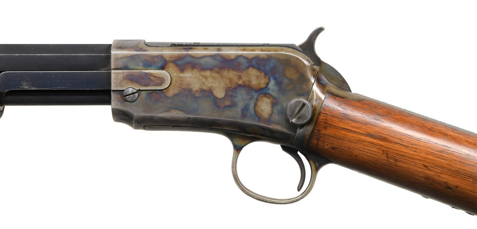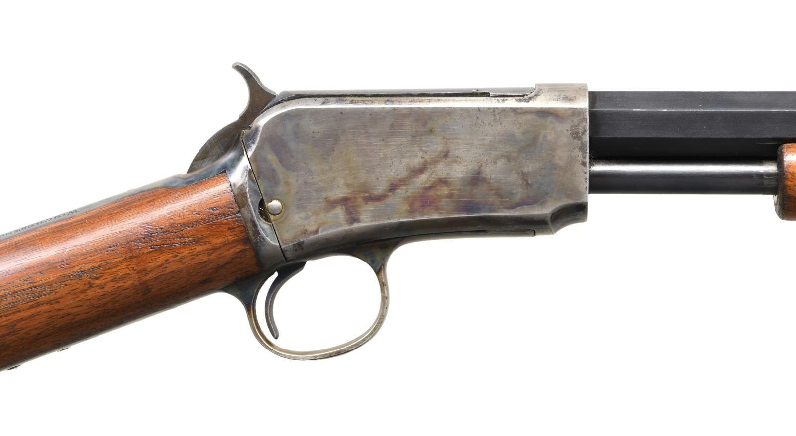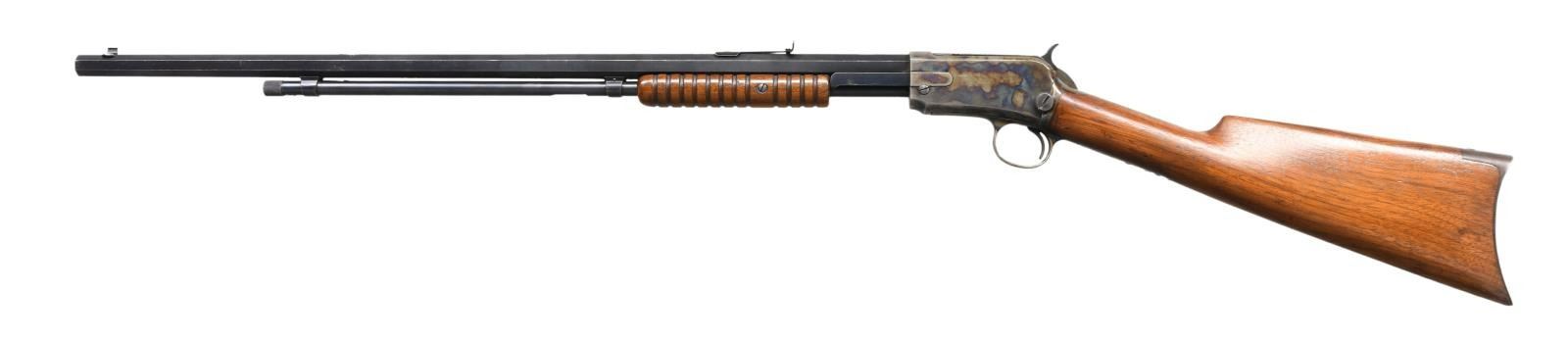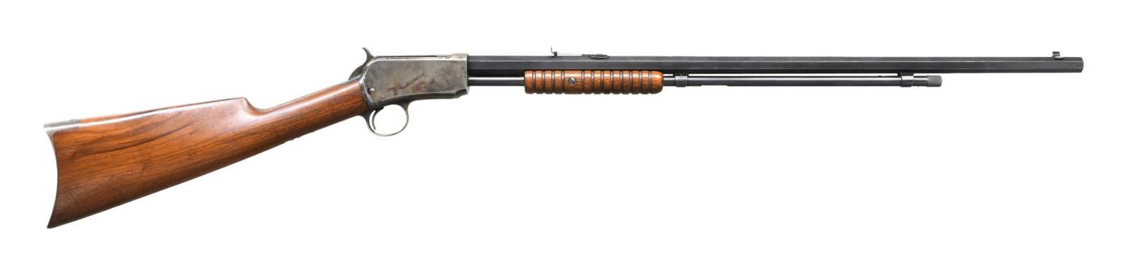 RIFLE. Cal. 22 Short. S#. 82769. Bbl. 24" octagon. Original sporting sights. Tubular mag. Case-colored action w/ mortised breech block. Grooved walnut slide handle & straight grip stock w/ crescent steel buttplate. Mfg. 1900. CONDITION: Bbl. and mag. tube are over 85% blue, showing slide & edge wear. Action & buttplate retain 70% of the case colors. Colors are bright on the left side of receiver, showing more fading in other areas. Original wood finish shows wear spots with scattered marks. The bright bore retains sound rifling. (22-2251/DS). CURIO. $2250-3000.