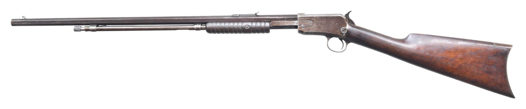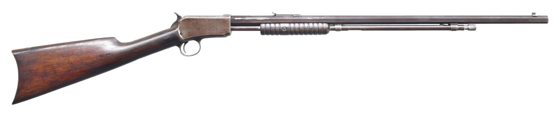 Cal. 22 Short. S# 307084. Bbl. 24" octagon, with sporting sights. Second Model action, with mortise breechblock. Tubular mag. Small rnd. slide handle, with straight grip walnut stock and crescent steel buttplate. Mfg. in 1907. CONDITION: metal has faded gray appearance. Bbl. and receiver have deep wrench marks. Age darkened worn wood, showing scratches and marks. Functioning action. Dark pitted bore, with worn rifling. (25-2736/DS). CURIO. $300-500.