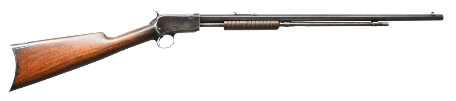 Cal. 22 Short. S# 338444A. Bbl. 24" oct. w/ original sporting sights. Tubular mag. Blue finish. Sm. rnd. grooved forearm & straight grip walnut stock w/ crescent steel buttplate. S# indicates approx. 1908 mfg. CONDITION: 30% dull blue fading to brown showing carry & edge wear. Wood has dark worn appearance showing scratches & handling marks. Sound mechanics. Bore has worn rifling w/ scattered spots of pitting. (21-4330/DS). CURIO. $350-500.