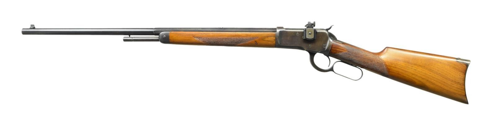 Cal. 25-20 WCF. S#. 825607. Bbl. 24" octagon to round. Replacement bead front sight, filler in rear dovetail with an aftermarket Lyman 66A receiver sight. Altered 2/3 length mag. Walnut forend and straight grip stock with crescent steel buttplate have added checkering. 1916 mfg. UNATTACHED ACCESORIES: 1 green box of Remington 25-20 ammo w/ 86 grain lead bullets. CONDITION: 70% dull fading reblued finish. Heavily sanded & refinished stocks. Bore has lightly worn rifling with small dark spots. (23-588/DS). CURIO. $600-1000.