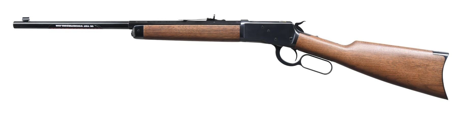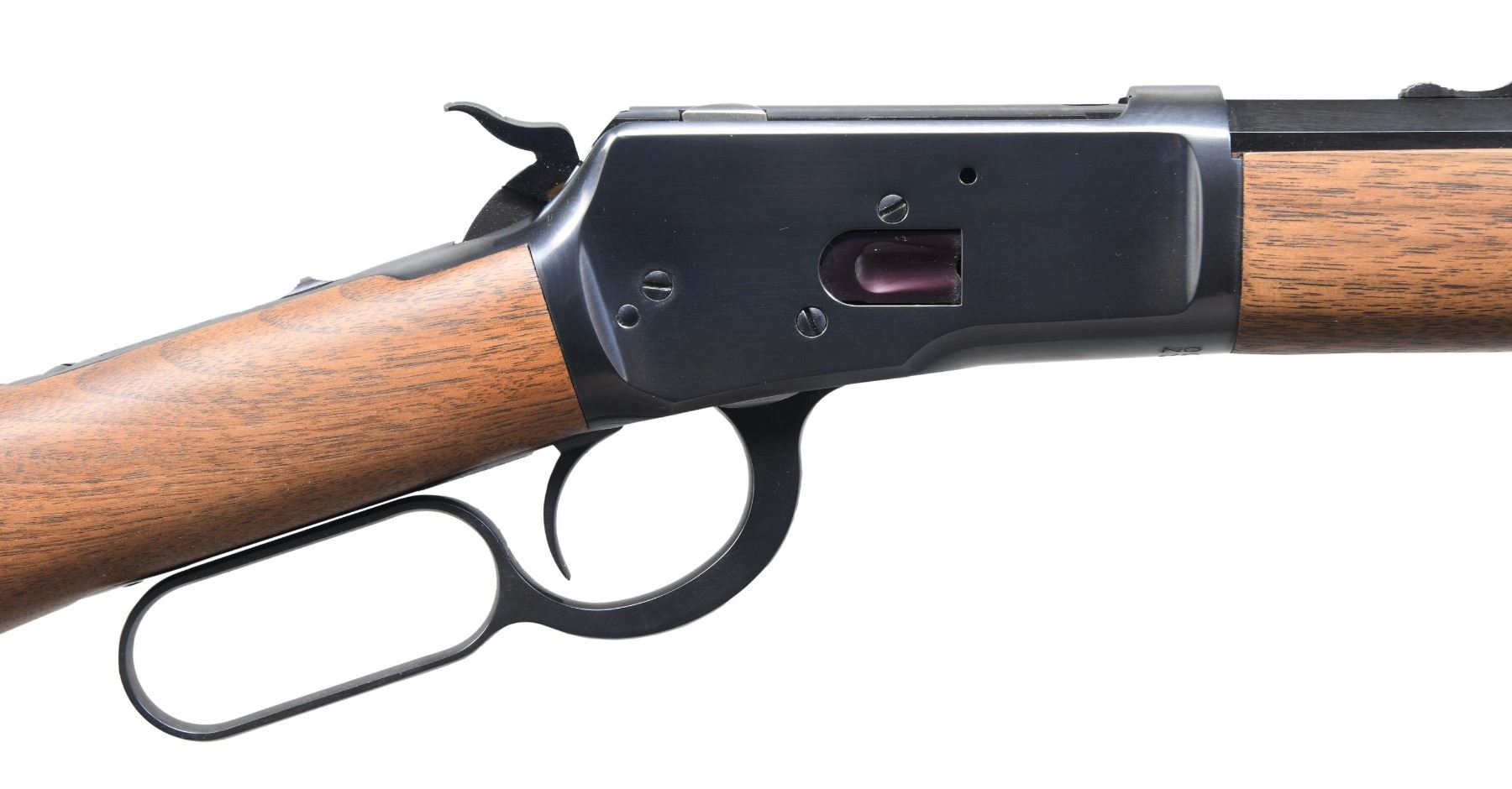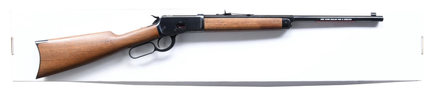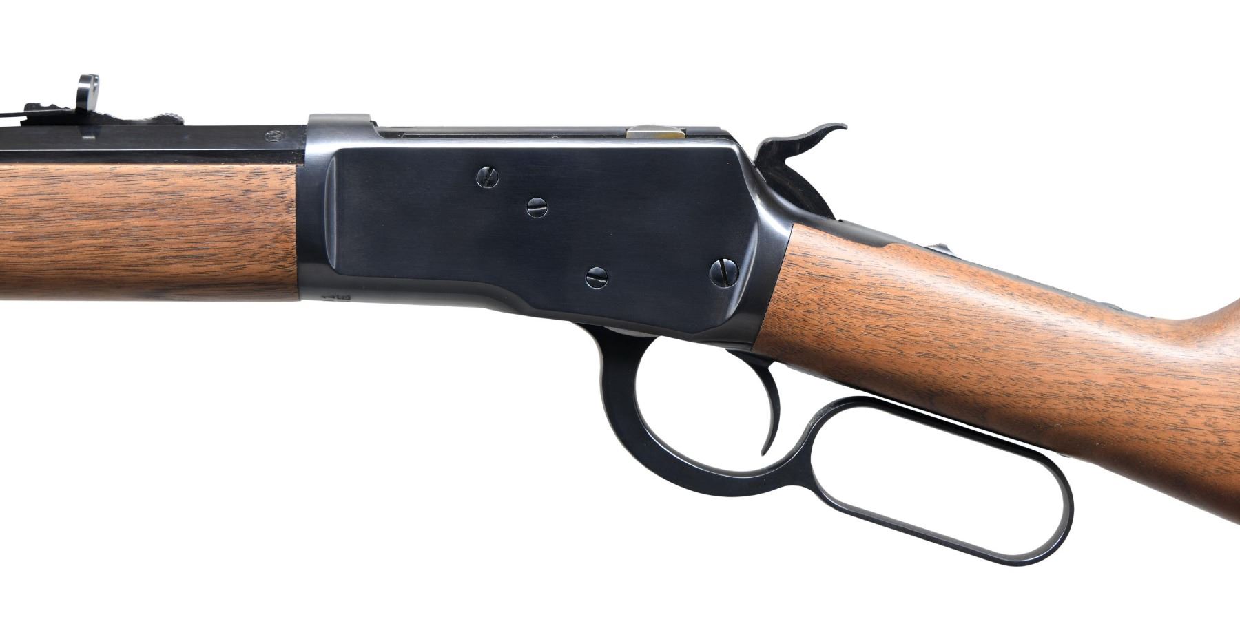 Cal. 45 Colt. S# 00091ZY92E. Bbl. 20", octagon-to-round, with sporting sights. Button mag. Action features top tang safety. Polished blue finish. Steel-capped rifle forearm and straight-grip walnut stock with satin finish and crescent steel buttplate. UNATTACHED ACCESSORIES: original box containing the instruction manual packet and safety lock. CONDITION: as new, with the box. (24-3030/DS). MODERN. $600-900.