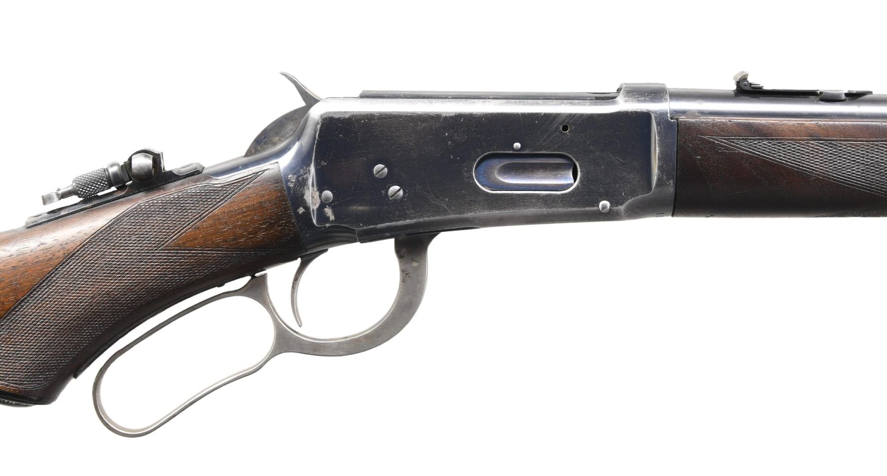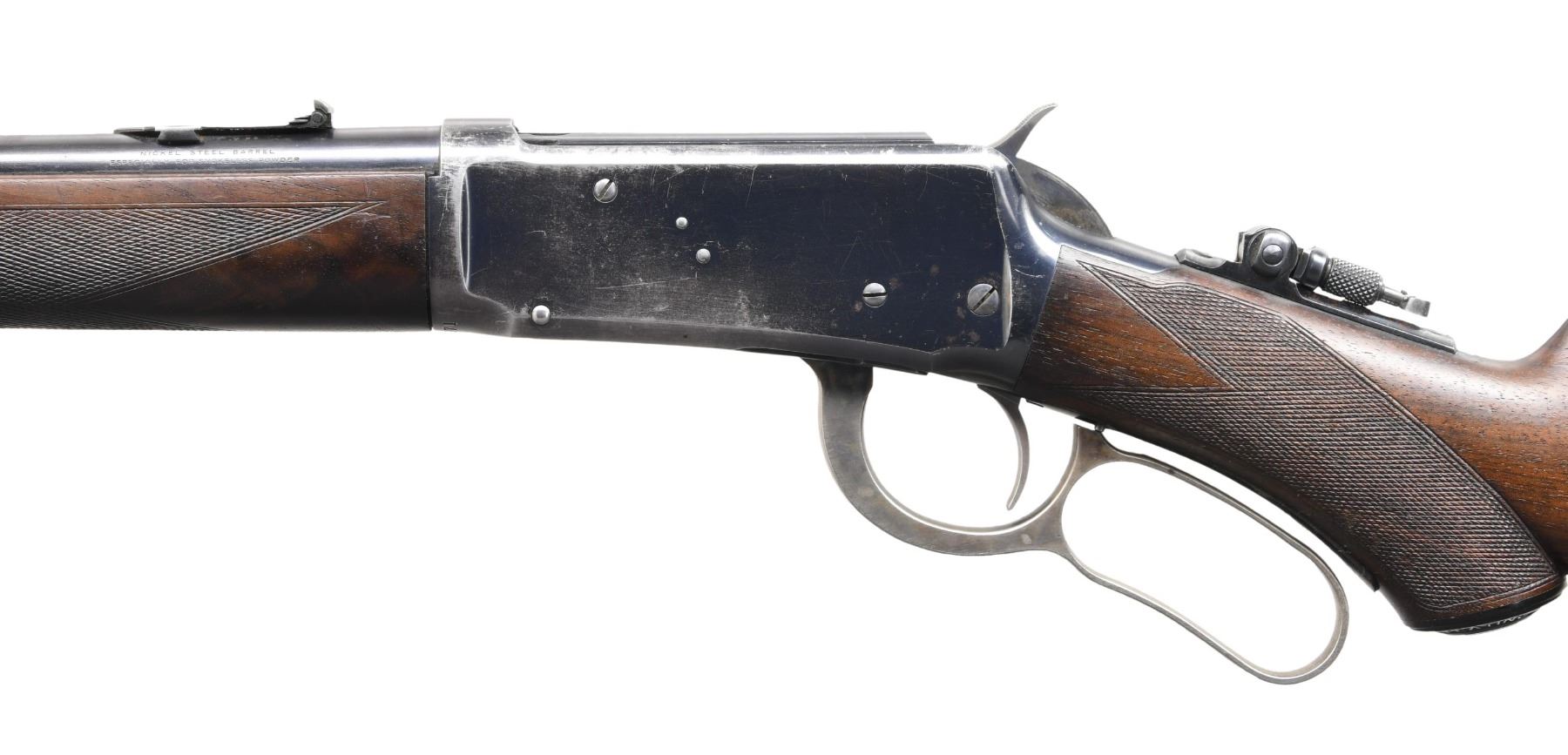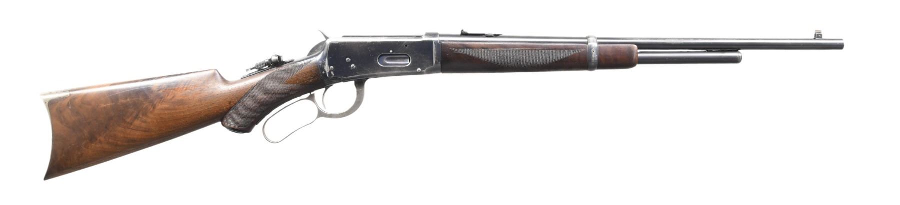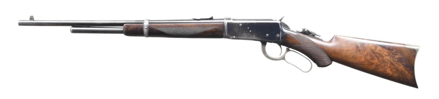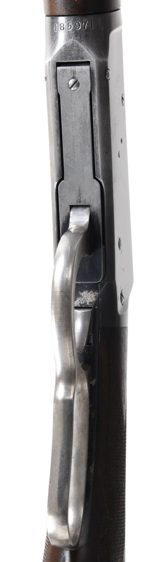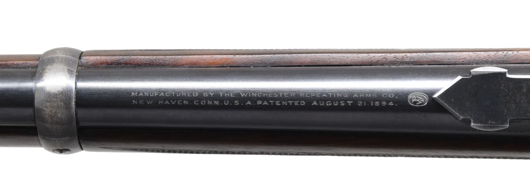 Cal. 30 WCF. S# 185971. Bbl. 20". Replacement pinned blade front sight w/ Winchester express rear sight & Lyman tang sight; 3/4rds length mag. Blue finish w/ case colored hammer, lever & crescent steel buttplate. Long wood forearm & hard rubber capped pistol grip stock of fancy walnut. Butt of stock is marked "94" over assembly number "16753". Style H factory checkering. UNATTACHED ACCESSORIES: records check from the Cody Firearms Records Office detailing the following information, "Serial number applied on July 01, 1903 / Type: Carbine / Caliber: 30 / Checkered stock, Pistol grip / Sights: Lyman front and rear / 3/4 Magazine / Rifle butt / Oil Finish / No sling ring / Received in warehouse on July 06, 1906 / Shipped from warehouse on September 01,1906, Order number 55406". CONDITION: bbl. & mag. tube retain over 80% lightly faded blue. Action retains 70% blue showing carry wear on edges w/ spotted finish loss on lower tang & rear right side of frame. Lever & hammer retain small amounts of case colors. Buttplate has faded to gray. Wood has lightly worn finish & checkering showing some age darkening w/ scattered scratches & small marks. Bore retains strong rifling having a lightly frosted appearance. Trigger pull is 2lbs 12oz. (24-4862/DS). CURIO. $3,000-5,000.