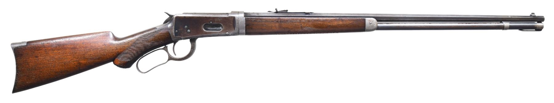 TAKEDOWN LEVER ACTION RIFLE. Cal. 32-40. S# 516699. Bbl. 26" scarce extra lightweight octagon of takedown style. Sporting sights. Full length mag. Blue finish w/ case colored hammer & lever. Walnut forearm & hard rubber capped pistol grip stock have style "I" factory checkering & crescent steel buttplate. Left inside of lower tang is stamped w/ assembly number "10164" followed by "C" indicating checkering. Mfg. 1910. CONDITION: 30% fading blue showing scattered small dents & handling marks. Stock & forearm have moderately worn finish & checkering, showing dents, scratches & marks. Forearm has a long crack on right side w/ a small chip on right side of tip. Takedown has a slight looseness. Sound action. Bore is dark retaining worn rifling. (25-740/DS). CURIO. $5,500-7,500.