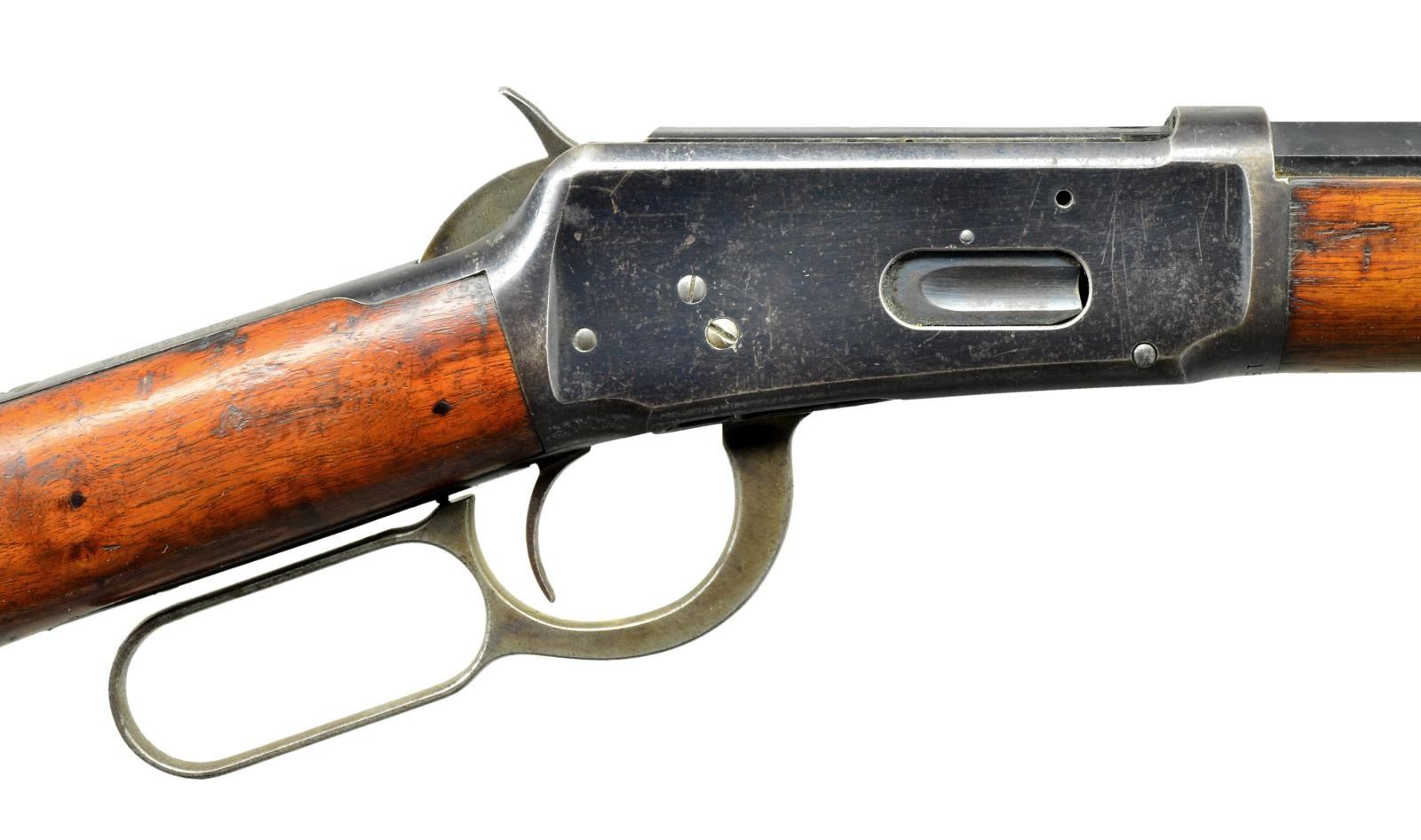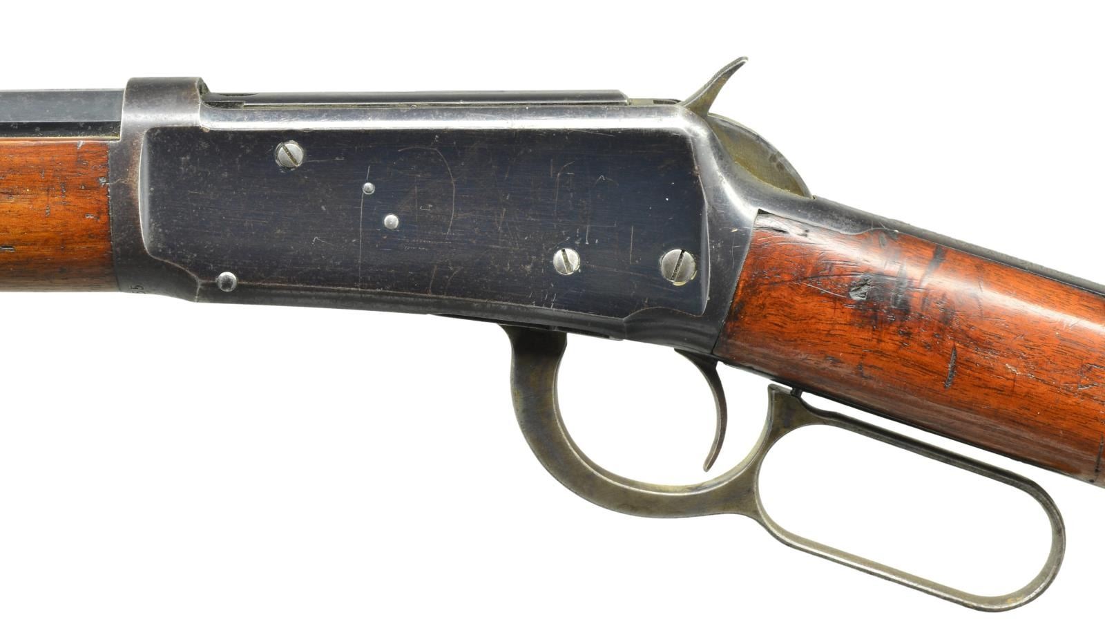 Cal. 30 WCF. S# 157655. Bbl. 26" oct. to rnd. of Nickel Steel. Sporting front sight w/ express rear sight. Button mag. Blue finish w/ case colored hammer, lever & crescent steel buttplate. Walnut forearm & straight grip stock. S# indicates 1899 mfg. CONDITION: over 80% lightly faded blue showing edge wear w/ scratches & scattered spots of corrosion. Lever & hammer retain some visible case colors. Original wood finish shows light wear w/ numerous scratches & sm. dents having sm. chips behind top tang. Strong mechanics. Bore retains lightly worn rifling w/ scattered very light pitting. (21-4612/DS). CURIO. $1,200-1,800.
