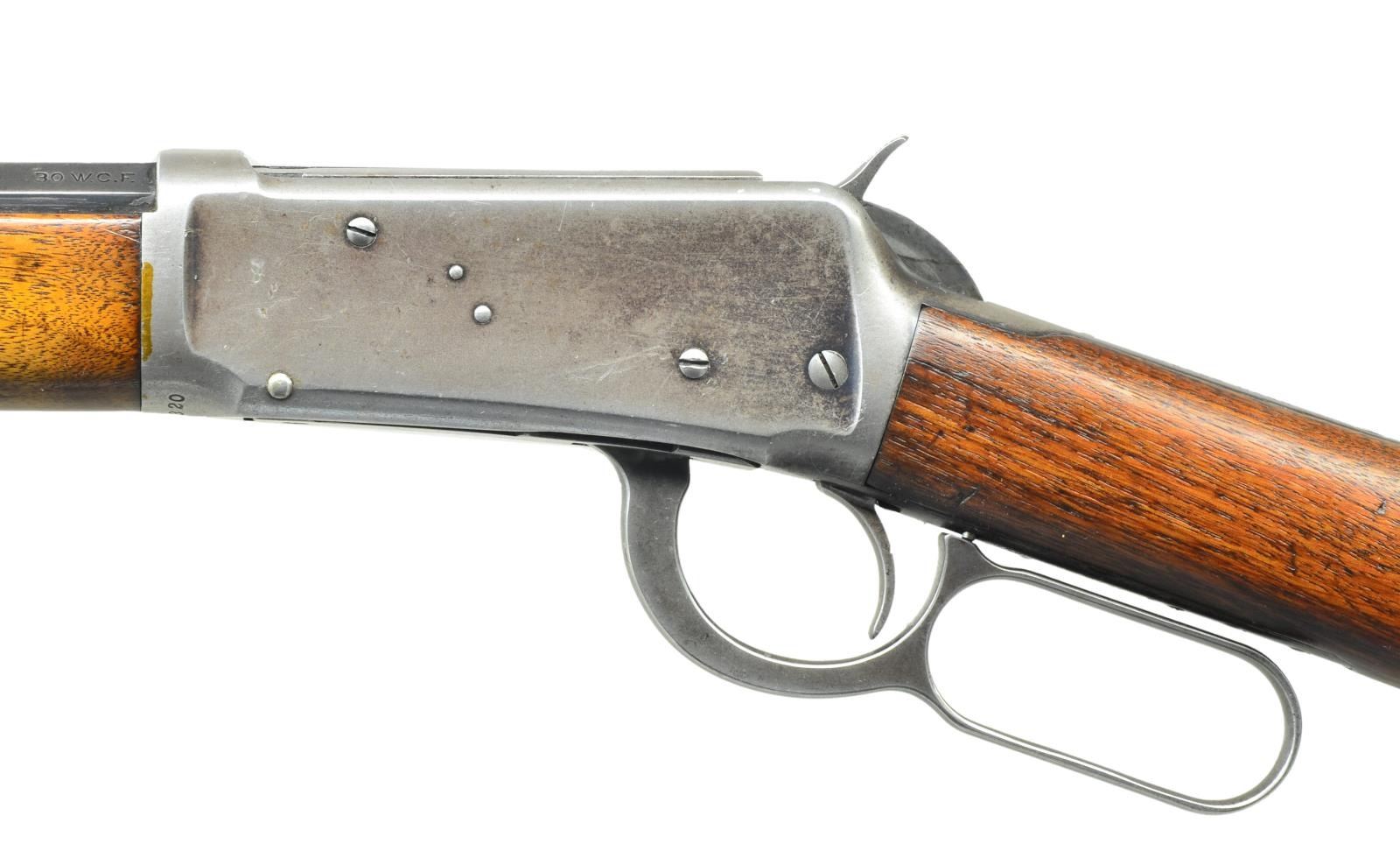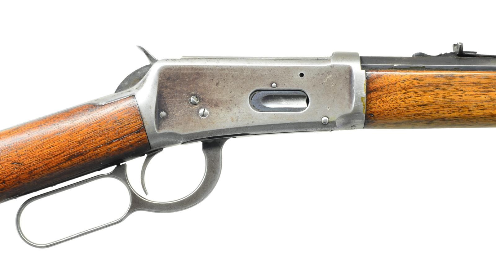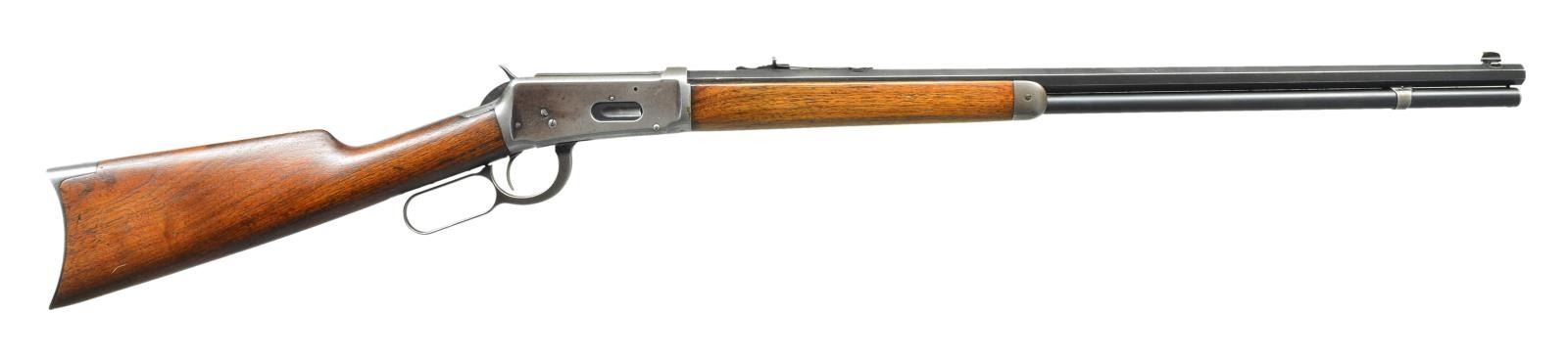 Cal. 30 WCF. S# 404320. Bbl. 26" oct. Marbles Sheard brass bead replacement front sight. Original sporting rear sight is altered to flat top configuration. Full length mag. Blue finish. Walnut forearm & straight grip stock w/ crescent steel buttplate. 1907 Mfg. CONDITION: Bbl. & mag. tube retain 70% fading blue. Action retains some blue on receiver sides w/ balance fading to gray. Sanded & refinished wood show sm. marks. Stock has crack extending from both sides of action. Bore has sound rifling w/ a dark appearance. (21-4251/DS). CURIO. $1,000-1,400.