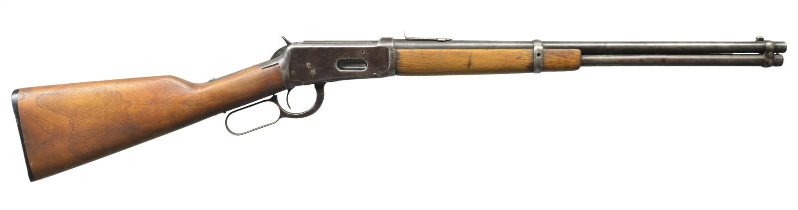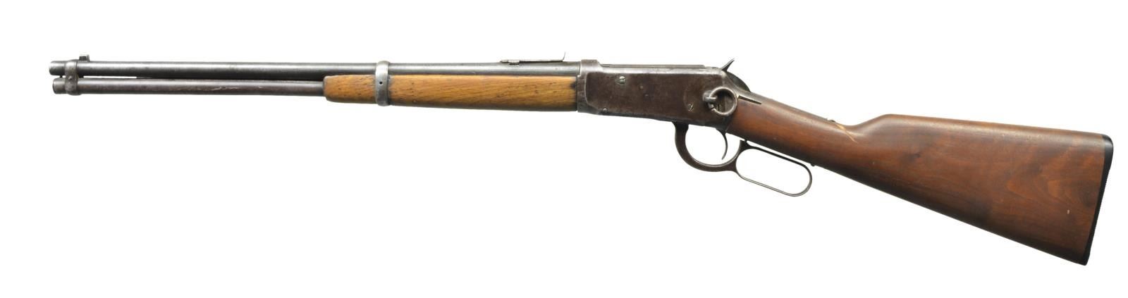 Cal. 30 WCF. S# 572335 (1910). Bbl. 20". Pinned blade front sight & replacement V notch rear sight. Full length tubular mag. Saddle ring & stud on left side of action. Top of receiver marked "M / E D". Replacement walnut forearm & straight grip stock w/ Fajen buttplate. CONDITION: fair overall. Metal turned dark brown patina w/ pitting & deep handling marks. Worn forearm finish w/ moderate handling marks. Very good buttstock w/ few deep handling marks. Missing & replacement screws throughout. Dark pitted bore. (21-4360/MD). MODERN. $250-350.