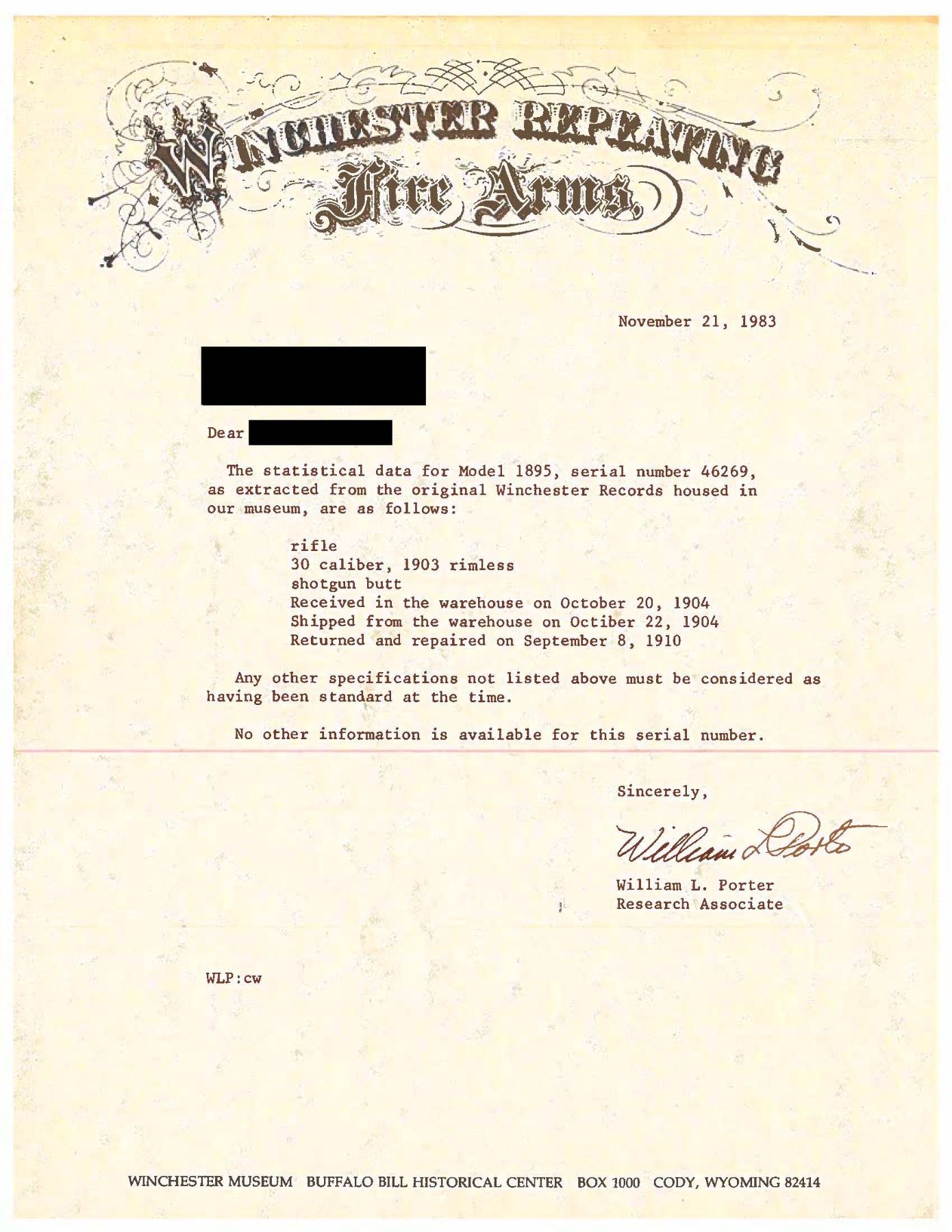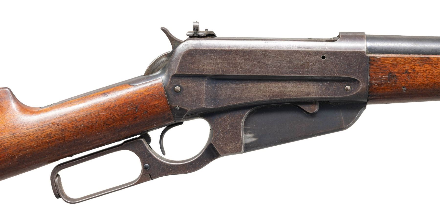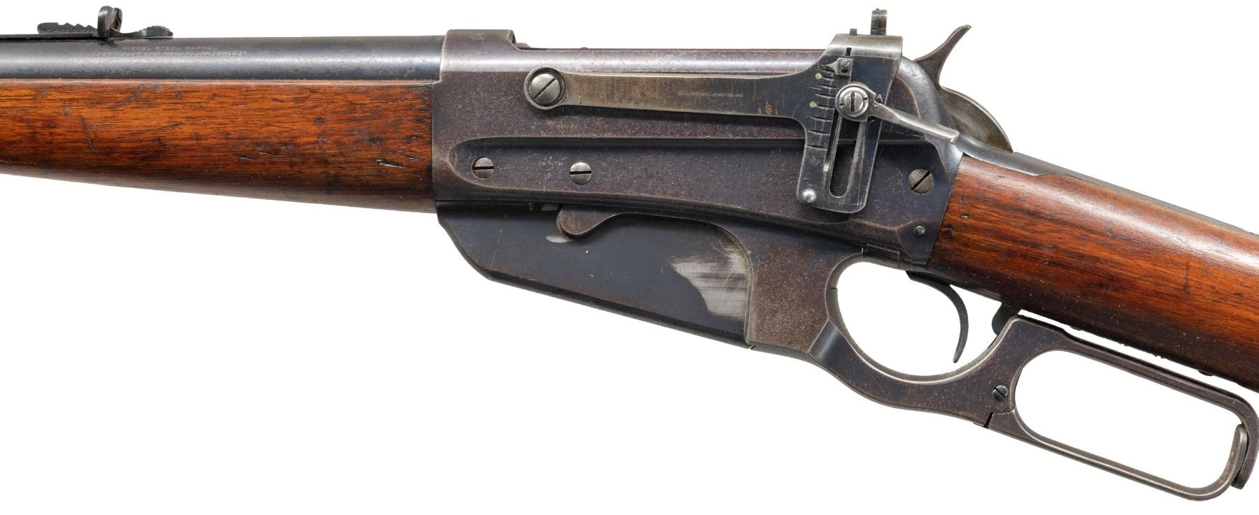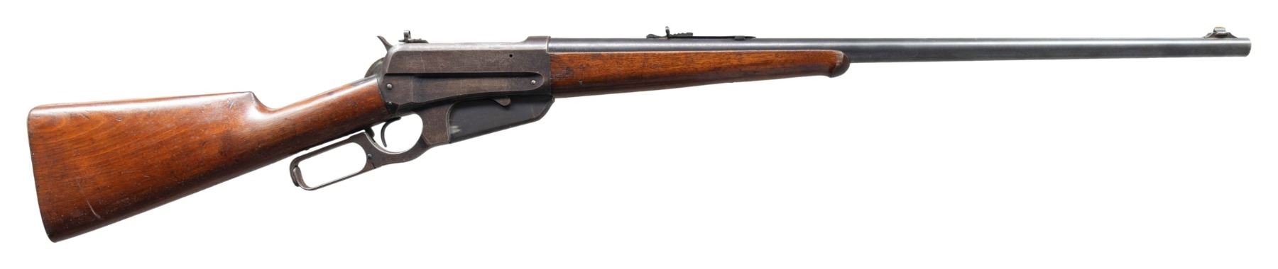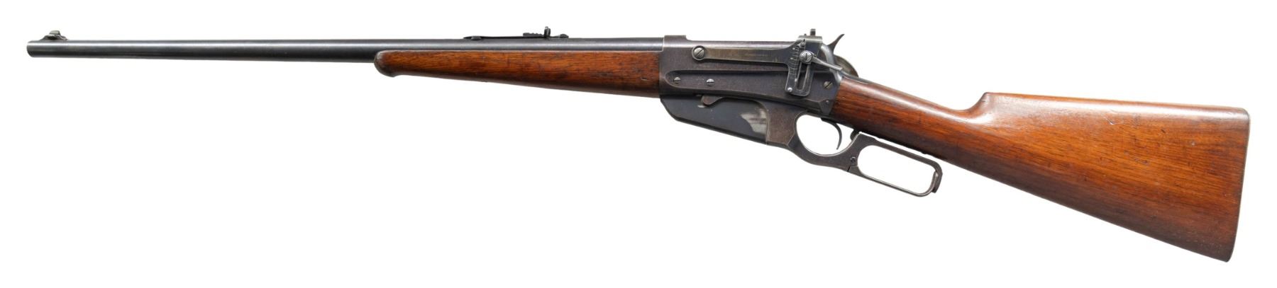 Cal. 30-03. S# 46269. Mfg. 1904. Bbl. 24" with dovetailed sporting front sight. Semi buckhorn style sporting rear sight. Matted receiver at the breech. Climbing Lyman receiver sight. Plain walnut stock set with ebony tipped schnabel forearm and smooth steel shotgun buttplate. CONDITION: overall fair condition with bbl retaining 50-60% original bluing, freckled old oxidation, and mild muzzle wear. Receiver retains approx. 60% original bluing with high edge wear, scattered handling marks, and freckled old spotty oxidation. Stock set has mild mildew spotting, scattered handling marks and scratches with some being more moderate. Bright bore with sharp rifling. (25-1294/ZAL). CURIO. $800-1,200.