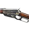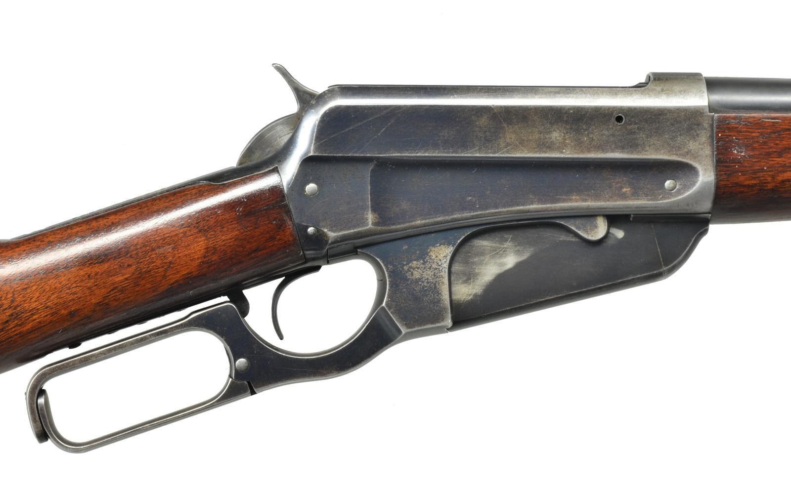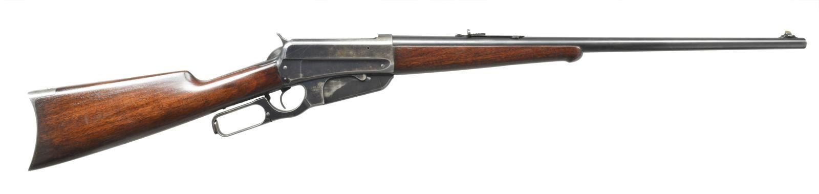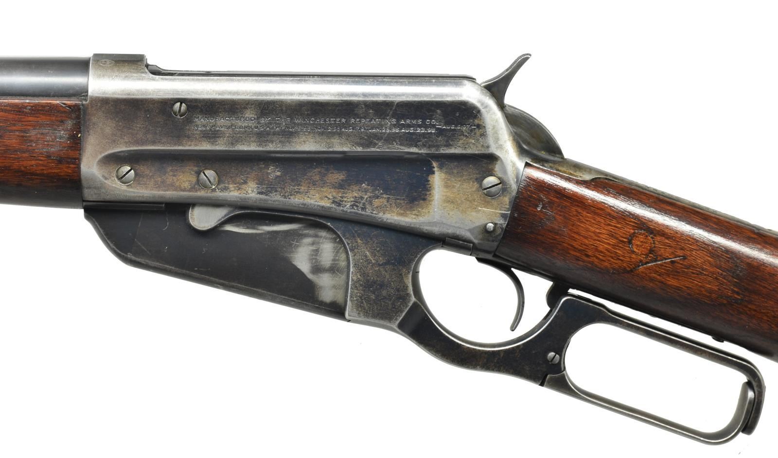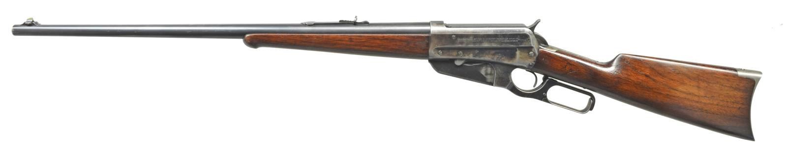 Cal. 35 WCF. S# 63539. Bbl. 24" tapered rnd. Ramp mounted sporting front sight w/ sporting rear sight. Blue finish w/ case colored hammer. Schnabel tipped walnut forearm w/ ebony inlay. Straight grip walnut stock w/ crescent steel buttplate. 1911 Mfg. CONDITION: bbl. retains over 80% lightly faded blue. Action retains 60% blue w/ areas fading to brown & showing carry wear. Sides of hammer show some case colors. Refinished wood shows scratches & marks. Bore retains strong rifling. (21-3665/DS). CURIO. $1,200-1,600.