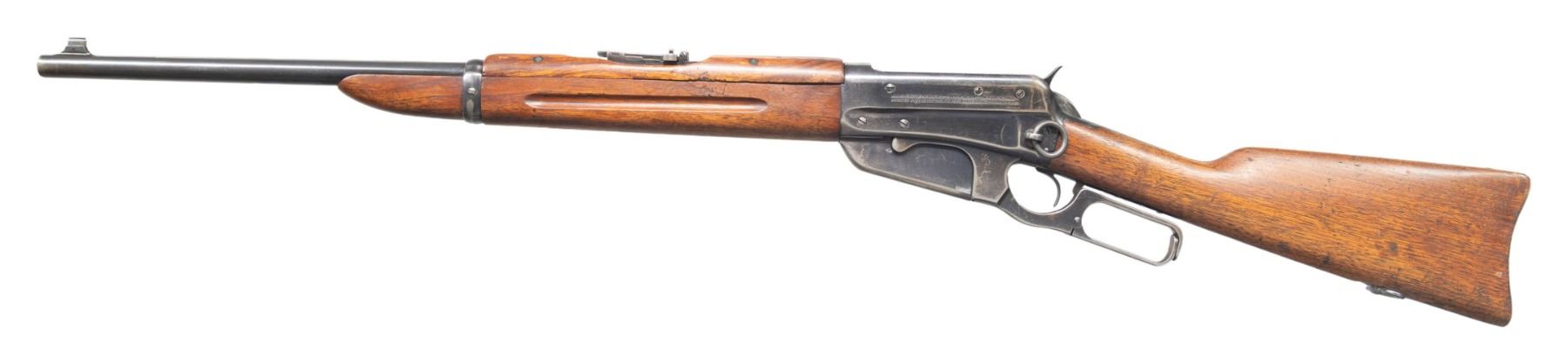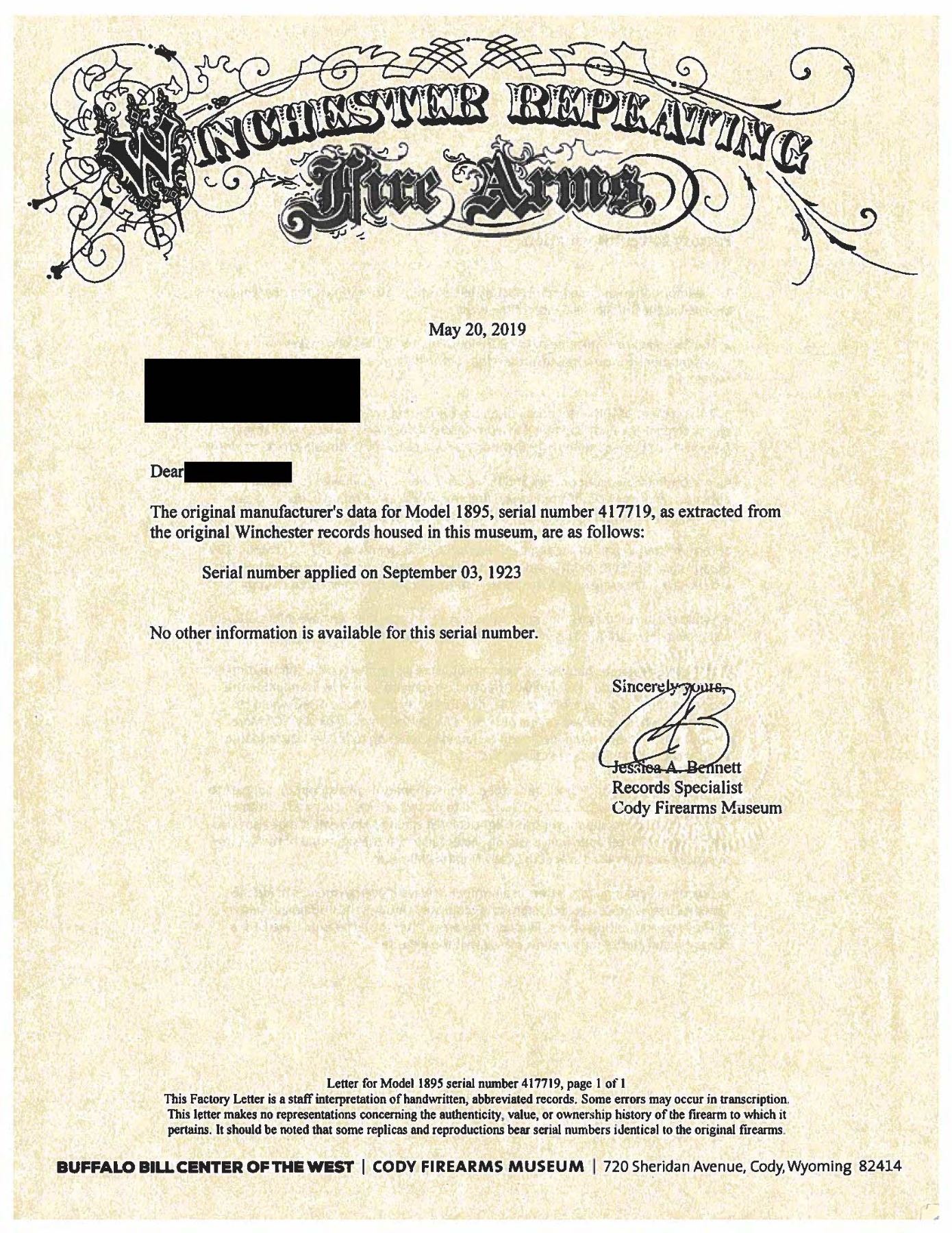 Cal. 30-06. S# 417719. Bbl. 22" with Redfield replacement pinned bead blade front and carbine leaf rear sight. Left sie of receiver has saddle ring and has 2 added holes with plug screws for sight attachment. Band fastened walnut foren, hand guard and straight grip stock have steel trapdoor carbine buttplate and sling swivels. UNATTACHED ACCESORIES: Cody Firearms Museum letter stating: The original manufacturer's data for Model 1895, serial number 417719, as extracted from the original Winchester records housed in this museum, are as follows: Serial number applied on September 03, 1923. No other information is available for this serial number. CONDITION: metal has over 60% lightly worn blue showing carry wear. Original wood finish shows scratches and marks. Sound action. Good bright bore. PROVENANCE: Estate Collection of John "Jack Dhooghe". (25-5539/DS). CURIO. $1,200-1,800.