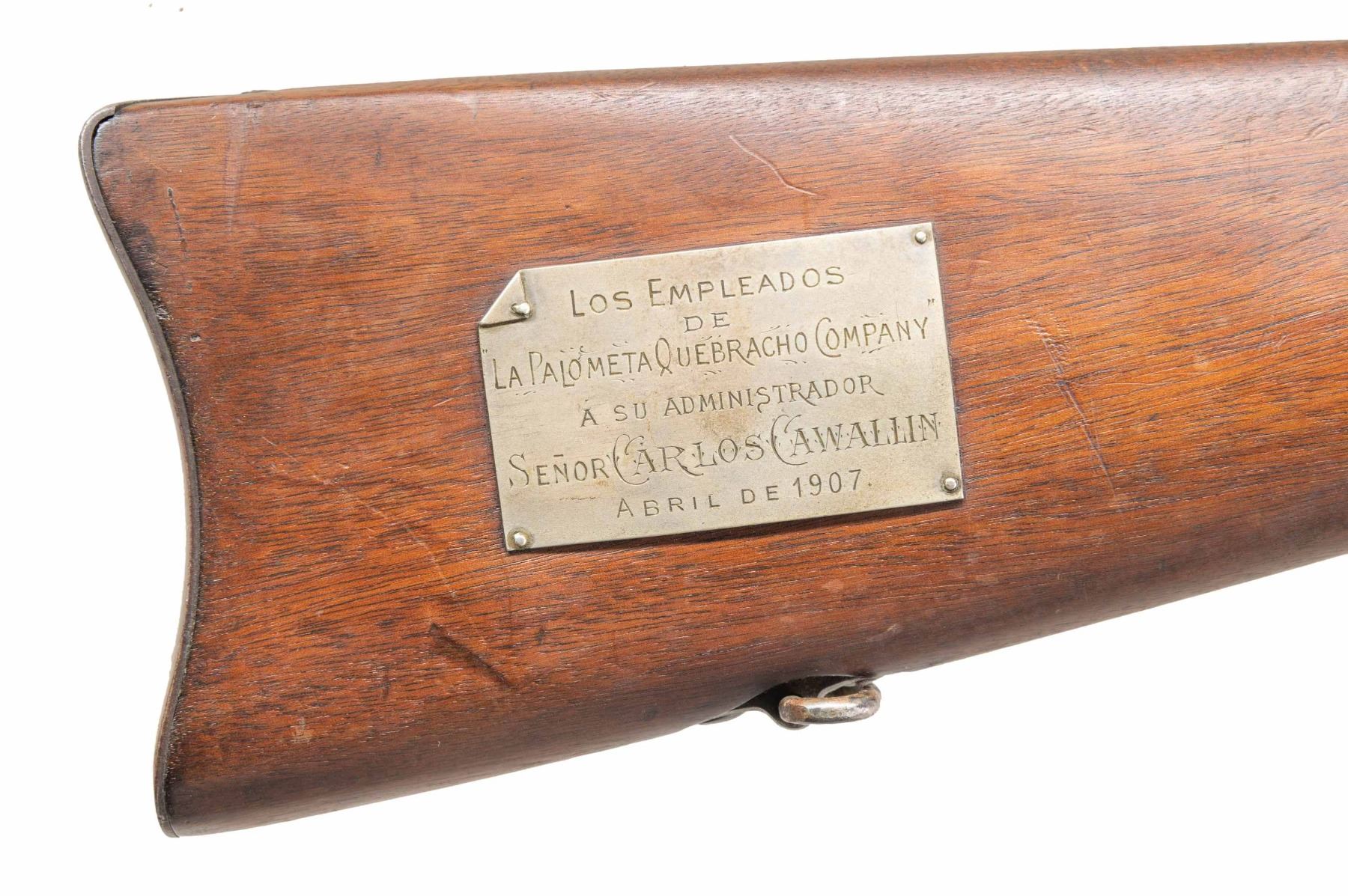 ADMINISTRATOR OF THE PALOMETA QUEBRACHO COMPANY BY THE EMPLOYEES IN APRIL OF 1907. Cal. 30 Army (30-40 Krag). S# 53449. Mfg. 1906. Bbl 28" with pinned blade front sight. Military wind gauge rear sight. Musket stock set with silver presentation plaque on the right side butt reading. " Los Empleados / De / La Palometa Quebracho Company / A Su Asministrador / Senor Carlos Cawallin / Abril de 1907". This translates to "The employees of the Palometa Quebracho Company to their administrator, Senor Carlos Cawallin, April 1907." Factory butt and band sling swivels. CONDITION: overall fine with lightly thinning bbl finish that retains approx 95% coverage most of the thinning being towards the muzzle and scattered light handling marks. Receiver finish has thinned with approx 30% remaining with the balance turning to a brown patina with light old oxidation freckling and scatt. Stock set is very good with some scattered light handling marks and a few dings. Silver plaque has a nice aged patina. Bore is lightly frosted with some pitting and sharp rifling. (25-1282/ZAL). CURIO. $1,000-1,500.
