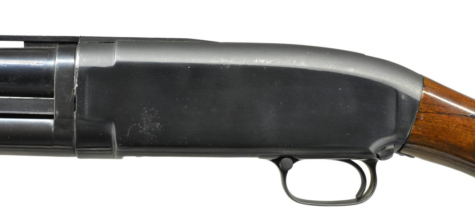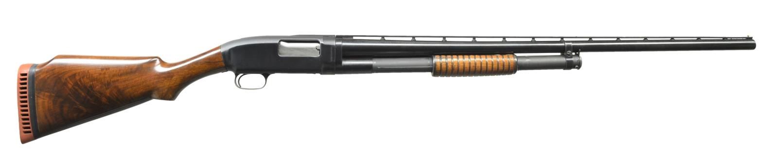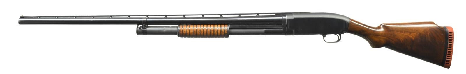 Cal. 12 Ga. S# 53109. Bbl. 30" of Nickel Steel w/ aftermarket Simmons rnd. post donut base VR. Fixed full choke. Brass front & mid beads. Sm. rnd. grooved forearm w/ a replacement Monte Carlo stock of fancy walnut. LOP: 13 3/4" over a red ventilated pad & 1/4" spacer. 1914 Mfg. CONDITION: 80% heavily polished reblued finish showing carry & slide wear w/ takedown marks on receiver. Bbl. markings & serial numbers are weak from polishing. Action shows some wear. Refinished forearm shows handling marks. Custom stock shows scattered scratches & marks w/ cracks extending from both sides of receiver. Head space ring is taken up 2 notches. Bore shows heavy pitting. (21-4372/DS). CURIO. $400-600.