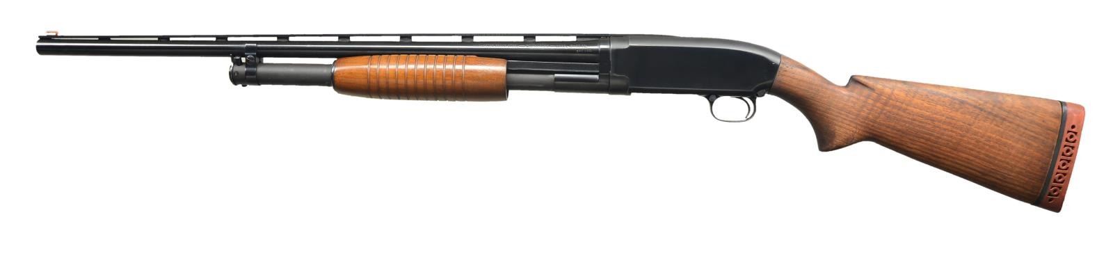 Cal. 20 Ga., 2 3/4". S# 648752. Bbl. 24" w/ Simmons oval post vent rib; grooved w/ extension plus silver mid bead & orange plastic front. Choke measures IC; barrel marked "2 3/4 MOD". Mfg. 1931 w/ radially grooved varnished walnut forend & plain replacement satin finished walnut buttstock having vintage red pad; 13 3/8" LOP. CONDITION: very good overall appearance as refinished; faint barrel extension S#. Occasional faint marks in blued finish plus some prior marks; matte finished mag. tube. Very good to excellent forend; about good buttstock w/ less than professional fitment of pad plus light marks on corners of grip bottom. Near excellent bore and proper mechanical functioning. (22-5311/NW). MODERN. $350-500.