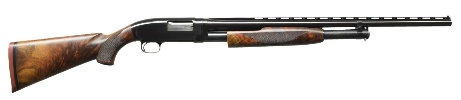 Cal. 20 Ga., 2 1/2". S# 36324. Bbl. 24" CYL marked; alloy Poly-Choke VR having white front bead plus provision for mid (not present); matching numbered extension. Mfg. 1924. Fitted with high grade checkered stock set of original appearance and satin finish. Extension forend; buttstock with logo grip cap and solid red Winchester pad (13 1/4" standard LOP). CONDITION: All aspects near excellent (including bore) with high quality refinish having proper sheen. Two small (less than 6-48) 3/8" spaced drilled and tapped holes in top of receiver (4 3/8" from front). (22-5989/NW). $500-700.