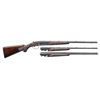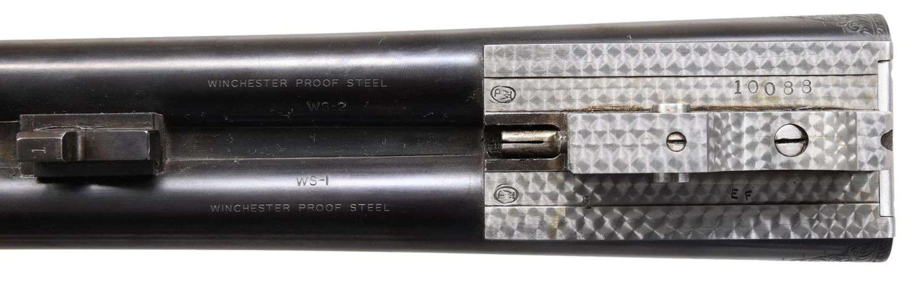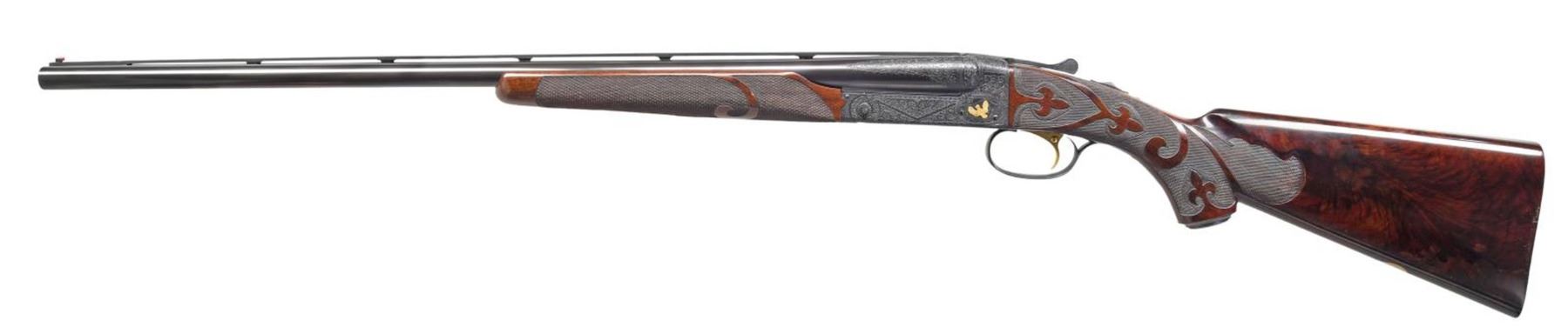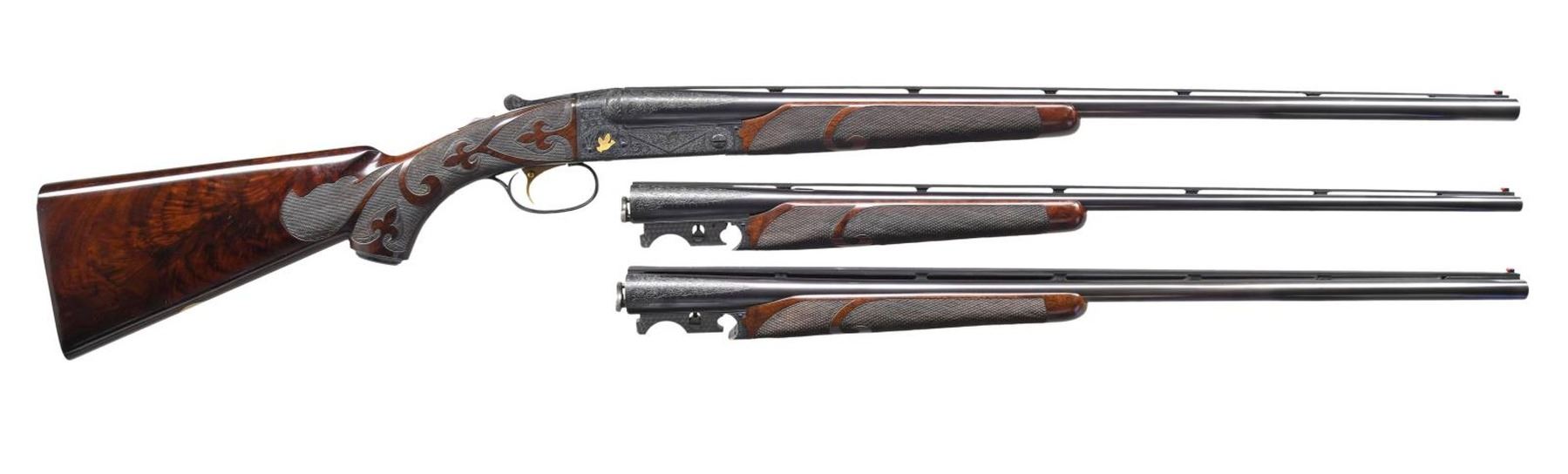 Cal. 20-2 3/4", 28-2 3/4" & 410-3". S# 10088. All bbls. are 26" with ventilated ribs having WS-1 & WS-2 chokes. Tops of ribs are marked "CUSTOM BUILT BY WINCHESTER". Flatside receiver w/ no. 6 factory engraving having gold inlaid pheasants on the floor plate with partridge on the sides and a woodcock on the trigger guard. Complimentary engraving extends to the breech end of the bbls., forearm, irons and forearm latches. Gold plated single selective trigger, selective ejectors. Water table of action, all bbls and inside of forearms are machine jeweled. Each bbl. has an individually fit ebony tipped beavertail forearm of fancy walnut with style B fluer-de-lis carving. Pistol grip stock of fancy walnut with style B fluer-de-lis carving. Engraved steel grip cap is marked "GRAND AMERICAN" in gold. Toeline has an unmarked gold presentation plate. LOP: 14 1/8" to fluer-de-lis checkered butt. DAC: 1 1/2". DAH: 2 1/2". Stock has a slight cast off for right-handed shooter. Weight with 20 ga. bbls: 7 lbs, 1.4 oz. UNATTACHED ACCESSORIES: Connecticut Shotgun Manufacturing Company letter dated April 11th, 2012. Letter identifies this 3 bbl. set as a Grand American shotgun obtained from the liquidators of U.S. Repeating Arms in New Haven CT. Letter confirms configuration of the gun. Letter further states "We have gone through this gun mechanically and detailed it out to 100% pristine condition, and the above listed information is being submitted to the Cody Firearms Museum Records Office. We hope that you enjoy this fine shotgun for many years to come, and we are certain that this gun will compliment your existing collection.". Letter is signed by Antony Galazan, President. Gun is housed in a John Hall molded case. CONDITION: near excellent as detailed by CSM retaining 99% wood & metal finish. All bores are near excellent. (23-4660/DS). CURIO. $20,000-30,000.