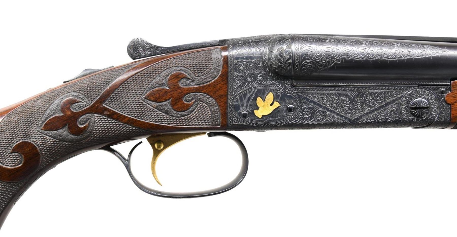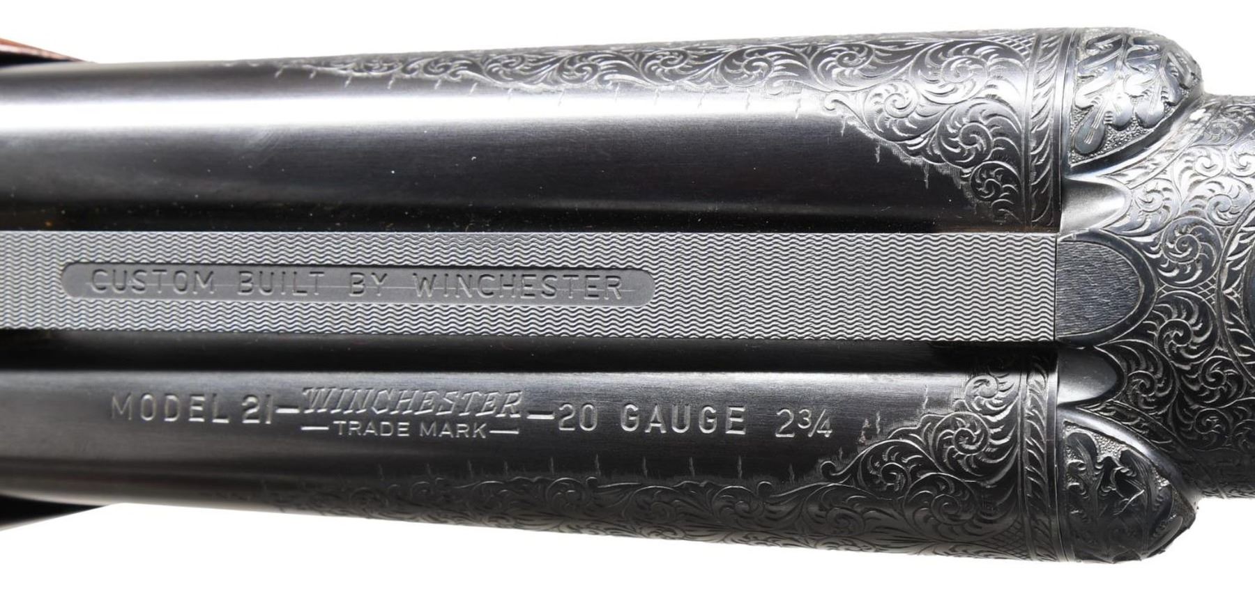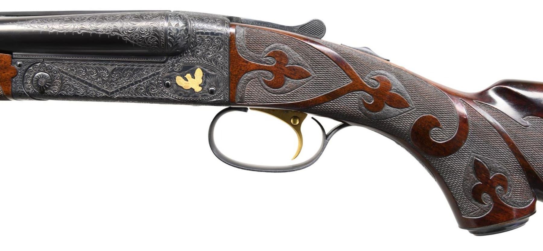 Cal. 20-2 3/4", 28-2 3/4" & 410-3". S# 10088. All bbls. are 26" with ventilated ribs having WS-1 & WS-2 chokes. Tops of ribs are marked "CUSTOM BUILT BY WINCHESTER". Flatside receiver w/ no. 6 factory engraving having gold inlaid pheasants on the floor plate with partridge on the sides and a woodcock on the trigger guard. Complimentary engraving extends to the breech end of the bbls., forearm, irons and forearm latches. Gold plated single selective trigger, selective ejectors. Water table of action, all bbls and inside of forearms are machine jeweled. Each bbl. has an individually fit ebony tipped beavertail forearm of fancy walnut with style B fluer-de-lis carving. Pistol grip stock of fancy walnut with style B fluer-de-lis carving. Engraved steel grip cap is marked "GRAND AMERICAN" in gold. Toeline has an unmarked gold presentation plate. LOP: 14 1/8" to fluer-de-lis checkered butt. DAC: 1 1/2". DAH: 2 1/2". Stock has a slight cast off for right-handed shooter. Weight with 20 ga. bbls: 7 lbs, 1.4 oz. UNATTACHED ACCESSORIES: Connecticut Shotgun Manufacturing Company letter dated April 11th, 2012. Letter identifies this 3 bbl. set as a Grand American shotgun obtained from the liquidators of U.S. Repeating Arms in New Haven CT. Letter confirms configuration of the gun. Letter further states "We have gone through this gun mechanically and detailed it out to 100% pristine condition, and the above listed information is being submitted to the Cody Firearms Museum Records Office. We hope that you enjoy this fine shotgun for many years to come, and we are certain that this gun will compliment your existing collection.". Letter is signed by Antony Galazan, President. Gun is housed in a John Hall molded case. CONDITION: near excellent as detailed by CSM retaining 99% wood & metal finish. All bores are near excellent. (23-4660/DS). CURIO. $20,000-30,000.
