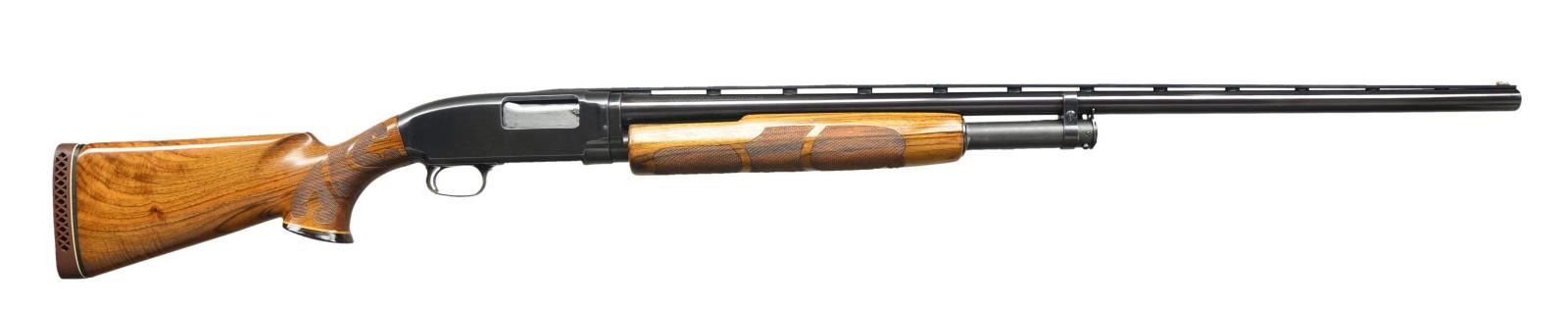 Cal. 12 Ga., 2 3/4". S# 653875. Bbl. 32" FULL choked with Simmons oval post rib extending onto receiver having brass mid bead and orange plastic front. Mfg. 1932 with longer than usual barrel having matching numbered extension. Wonderful walnut checkered stock set having marbled figure, extension forend and white spaced rosewood teardrop shaped capped grip. Checkering with multi panels having ribbons and fleur de lis borders; Pachmayr White Line brown ventilated recoil pad (normal 13 5/8" LOP). Bottom of cartridge lifter is engine turned. CONDITION: very good to excellent overall with professional metal refinish; quite possibly by Simmons when rib was installed. Barrel extension numbers somewhat faint and slight evidence of receiver finish blemishes on right side at rear. Occasional faint finish marks plus function wear on mag. tube. Stock set is close to near excellent with pad fitment not commensurate with the balance of the firearm. Near excellent bore. (22-5315/NW). MODERN. $350-500.