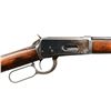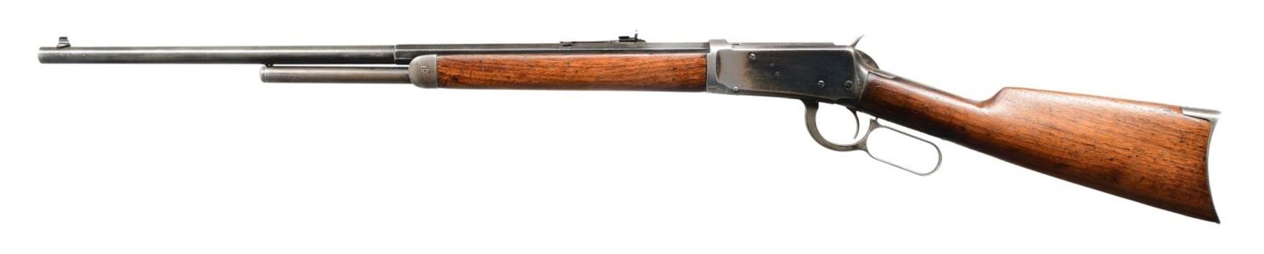 Cal. 32 W.S. (32 Special). S# 427837. Bbl. 24 5/8" (originally 26") part round, part octagon with dovetailed Marble No. 5 front sight and Winchester 22-F Sporting rear. Mfg. 1907 with rifle stock set having crescent buttplate and capped forend. Neatly stamped (about 1/16" high) 'TELLIS COLONG" ("NG" not very clear; possibly "WG") on top flat in front of manufacturer's markings. CONDITION: fair overall with sanded and refinished stock set; unrepaired crack on right side in lower front wrist area. Refinished metal well worn from cradling and use. Poor to fair bore that is dark, worn and with even pitting. Shallow groove filed at top front of receiver likely for sighting without rear barrel sight plus hair trigger. Not Curio due to shortened barrel. (24-1543/NW). MODERN. $450-600.