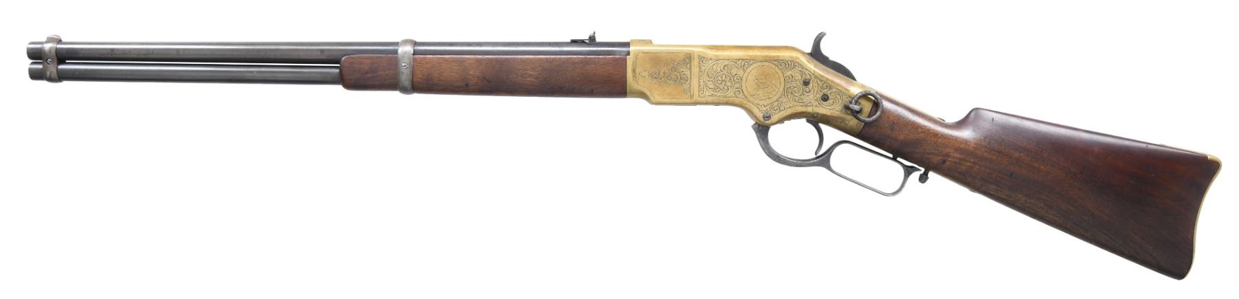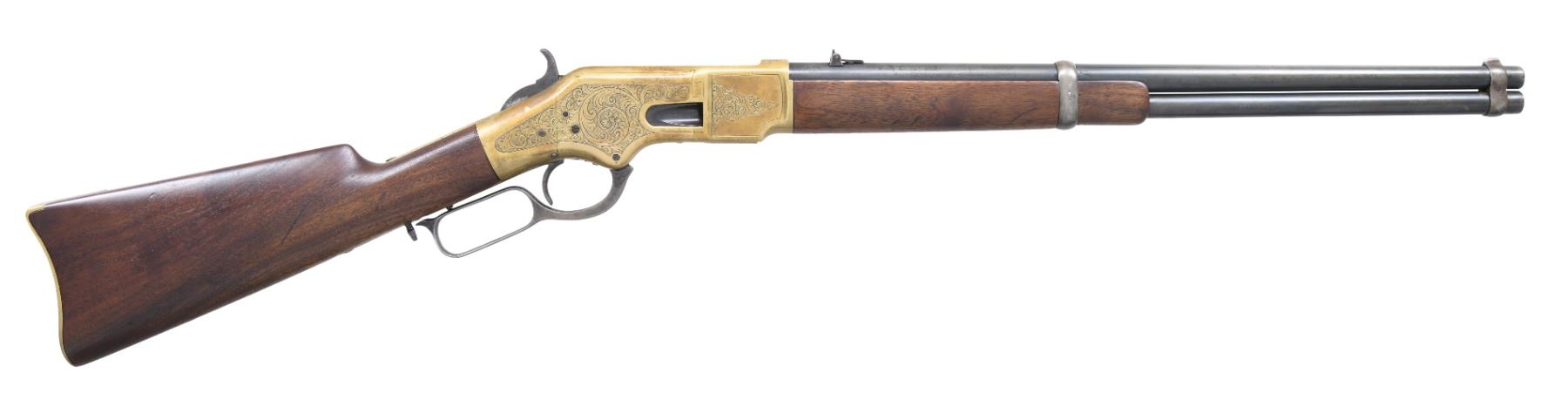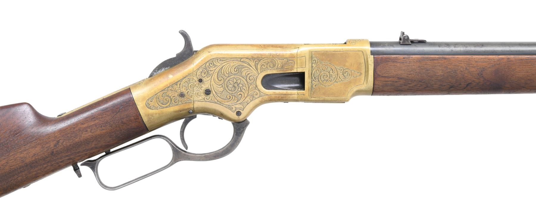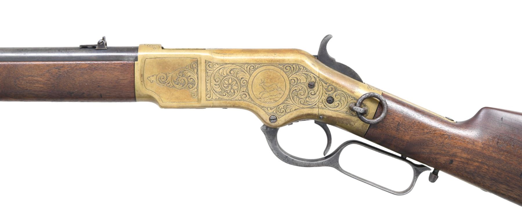 ACTION SRC. Cal. 44 HRF. S# 132272. Bbl. 20". Mag. band mounted blade front sight w/ non-adjustable carbine leaf sight. Full length magazine. Brass action has saddle ring on left side. Receiver sides along w/ upper & lower areas have generous coverage of custom aftermarket hand engraving. Foliate scroll engraving w/ punch dot backgrounds features a vignette w/ a running buck on the left sideplate. Walnut carbine forearm & stock w/ brass trapdoor carbine buttplate. UNATTACHED ACCESSORIES: included is a Cody Firearms Museum Records Office Show Search Form detailing the following information, "Date In: 9/1/1876 / Carbine / Date Shipped: 12/21/1876 / Order #: 7997". CONDITION: bbl. & mag. tube have a pleasing blue-gray coloration indicating some touch-up finishing. The brass action has started to acquire a mild tarnish. Stock & forearm have good refinish showing scattered scratches & marks. Sound mechanics. Bore retains largely intact rifling showing spots of pitting. (01-26422/DS). ANTIQUE. $3,000-4,000.