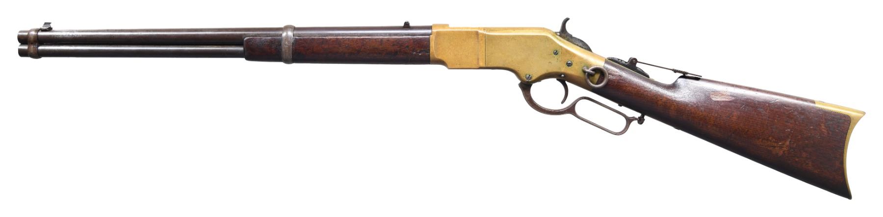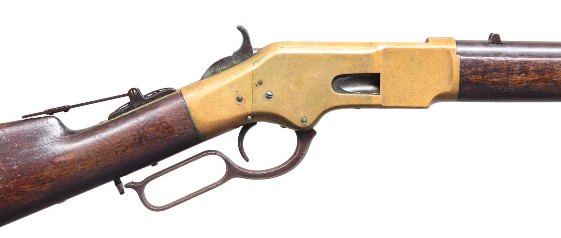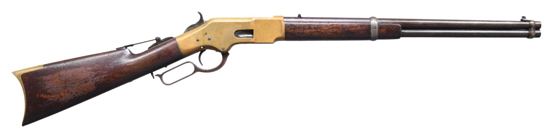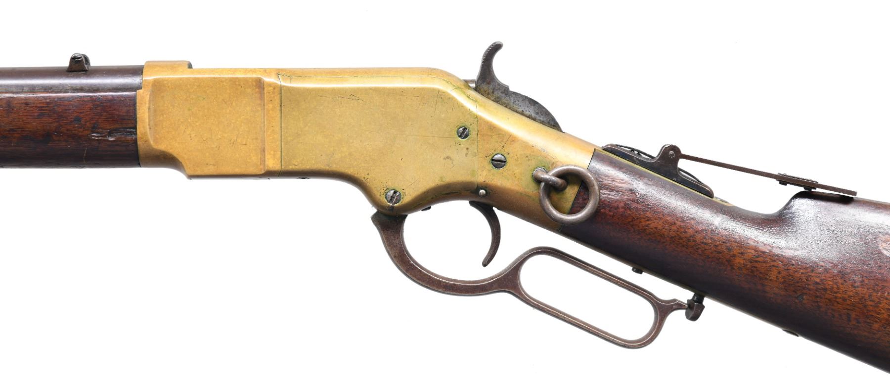 Cal. 44 HRF. S# 26172 is found behind the trigger & followed by a sideways "L". Bbl. 20" w/ replacement bead front sight, base only for rear sight & graduated tang peep sight. Full length mag. Brass action has saddle ring on left side. Carbine forearm & straight grip stock w/ brass trapdoor rifle buttplate. CONDITION: bbl. & mag. tube finish has faded to brown showing small spots of corrosion. Brass shows a dark patina w/ scattered scratches & marks. Wood has an age darkened worn appearance w/ dents, scratches & marks. Left side of forearm has a chip extending from action. Stocks has small cracks extending from toe & lower tang w/ small chips on both sides of the top tang. Dark bore retains intact rifling showing some pitting w/ a light ring near the muzzle. (01-26393/DS). ANTIQUE. $3,000-4,500.