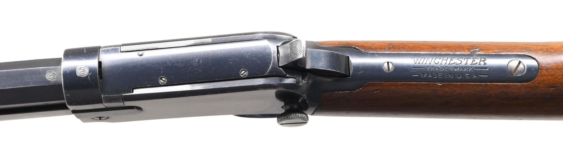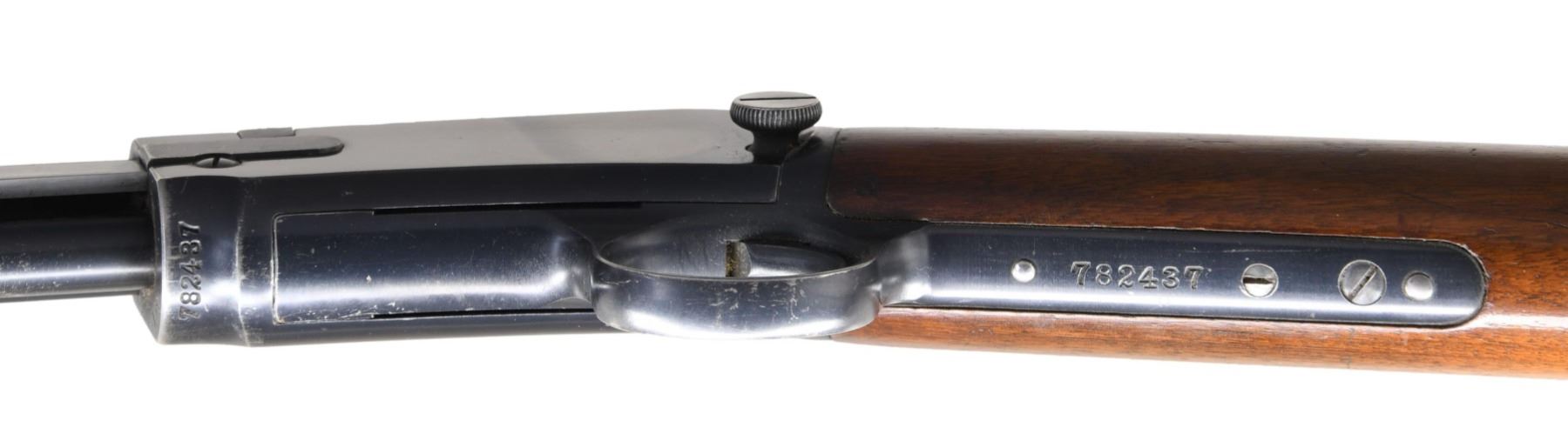 Cal. 22 Long Rifle. S#. 782437. Bbl. 24" octagon w/ standard sporting sights. Tubular mag. Blue finish. Grooved forend & pistol grip walnut stock w/ crescent steel buttplate. The desirable 22 LR chambering was introduced in 1919 at about S# 610,000. Mfg. 1929. CONDITION: over 80% original blue showing edge & carry wear. wood shows light wear & scattered small dents & marks. Very good bore.(24-5559/DS). CURIO. $1800-2700.