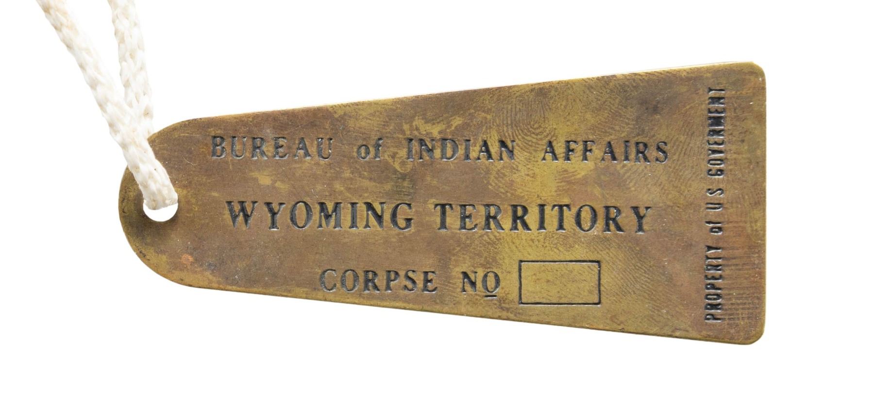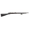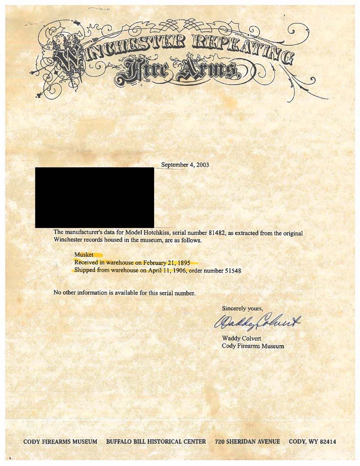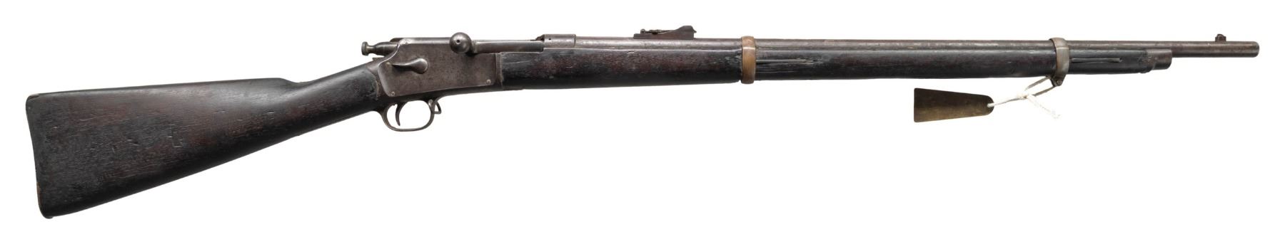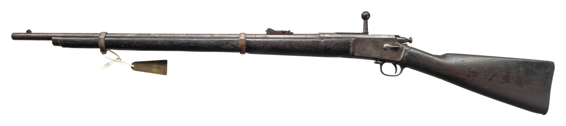 Cal. 45-70. S#. 81482. Bbl. 28" round. Pinned blade front with military style leaf rear sight. Blue & case colored finish. Tubular magazine is located in the stock. Band fastened forend & walnut stock with steel musket buttplate. Right side of the stock has hand carved initials that mat be "F A". UNATTACHED ACCESORIES: apparently modern 3 1/4" brass tag marked: " BUREAU OF INDIAN AFFAIRS / WYOMING TERRITORY / CORPSE NO. ___ / PROPERTY OF US GOVERNMENT". Cody Firearms Museum letter dated 9-4-2003 and signed by Waddy Colvert. The letter states: "Musket / Received in warehouse on February 21, 1895 / Shipped from warehouse on April 11, 1906, order number 51548". CONDITION: the metal has a mottled brown appearance with areas of rust & pitting. The wood has an oil soaked appearance with dent & marks having chips & small cracks around the metal. Cleaning rod is not present. Functioning action. Pitted bore with worn rifling. (01-26766/DS). ANTIQUE. $800-1,200.