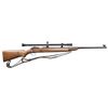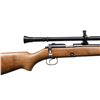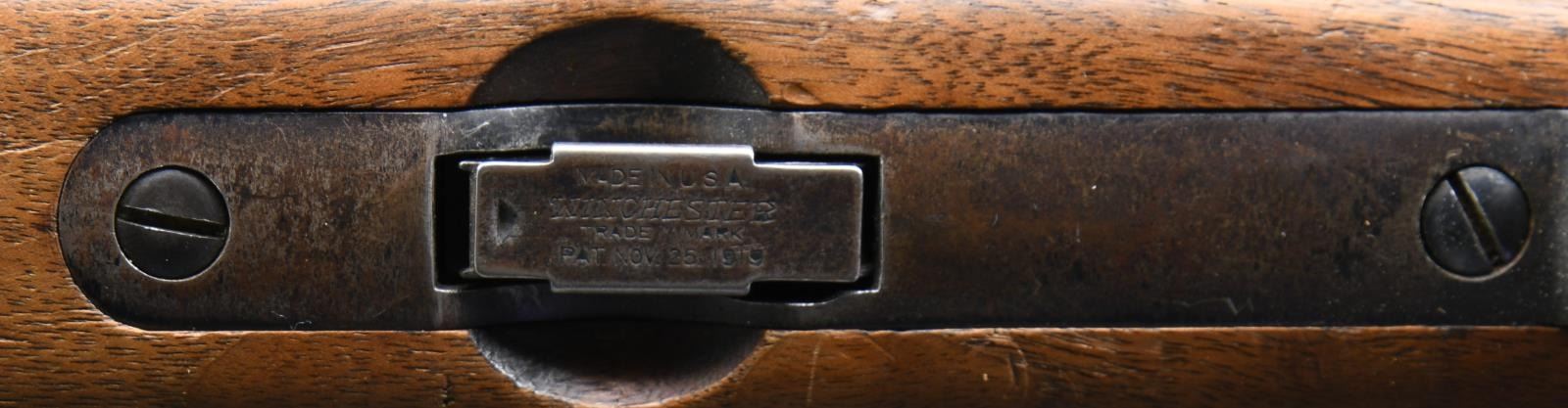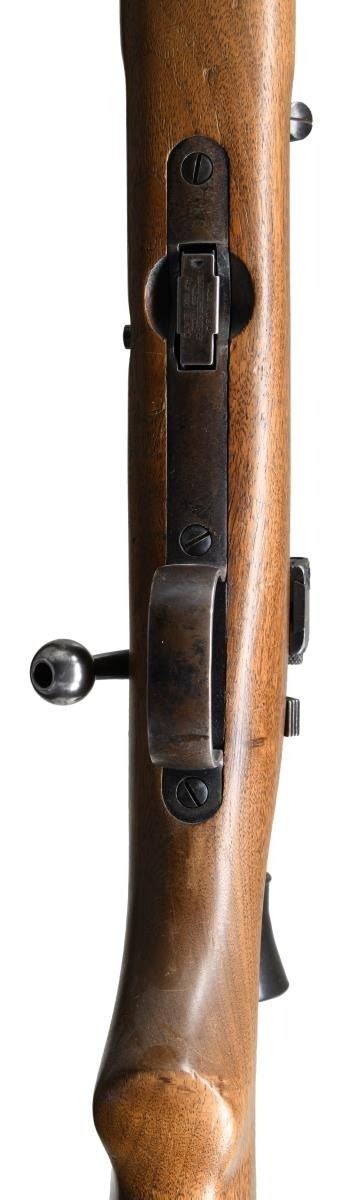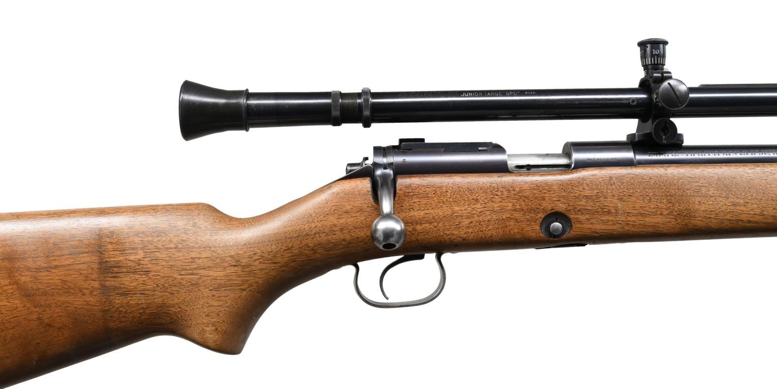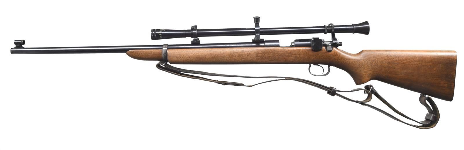 Cal. 22 LR. S# 31442. Bbl. 28" round. Ramp mounted globe front sight w/ blank filler in receiver sight. Lyman Jr. Targetspot 8 power scope w/ standard crosshairs. Walnut stock w/ checkered steel buttplate. Leather sling on original swivels. Mfg. 1935. MAGS: 1 Five round w/ November 25, 1919 patent date. CONDITION: over 97% bbl. & action blue. Floorplate & forearm band show flaking. Stock has lightly worn finish showing scattered scratches & marks. Bright near excellent bore. Scope has good optics. (23-4654/DS). CURIO. $1,000-1,500.