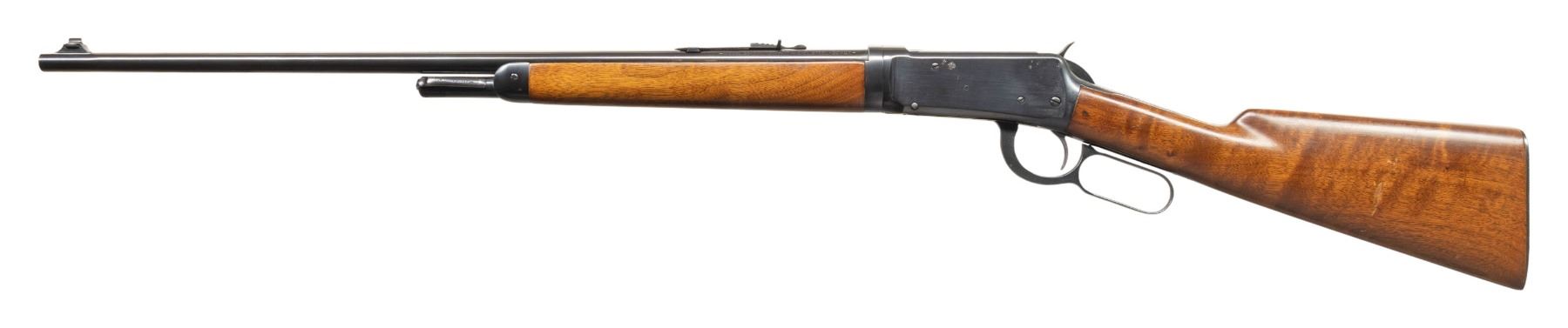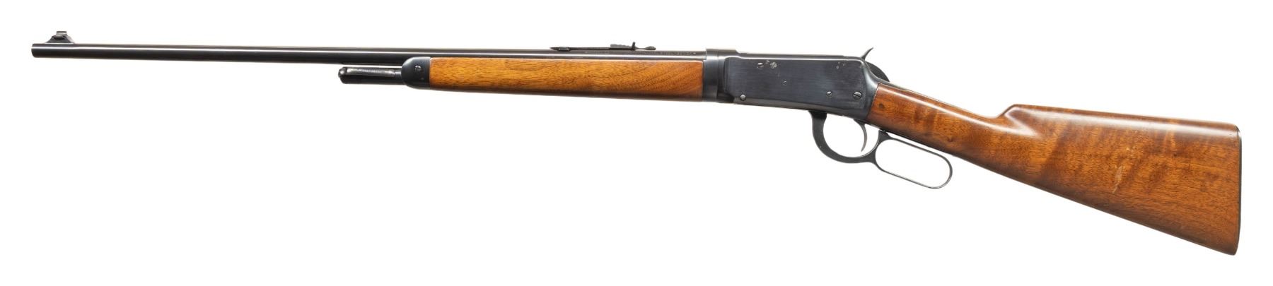 Cal. 30 WCF. S# 3476 (Mfg. 1926). Bbl. 24.25". Bead front sight with elevator rear sight. Half length takedown mag. Walnut stock set w/ grooved steel buttplate. CONDITION: very good reblued metal finish with a few finish loss spots on receiver. Sanded & refinished wood has scattered handling marks; reblued buttplate. Very good rifling with a few dark spots. (26-53/MD). CURIO. $600-900.