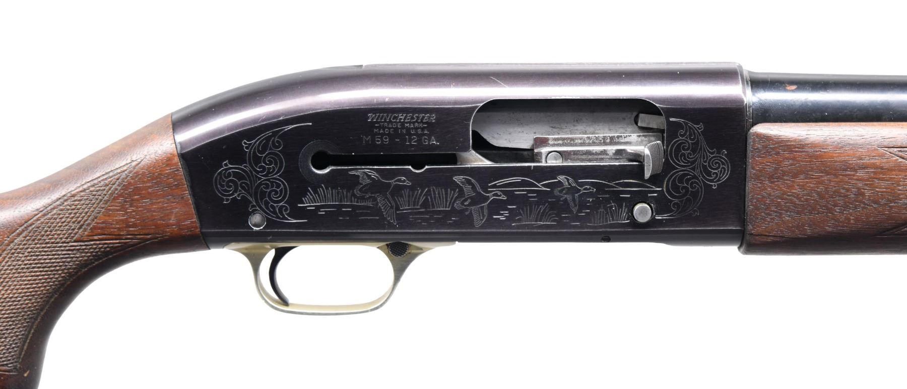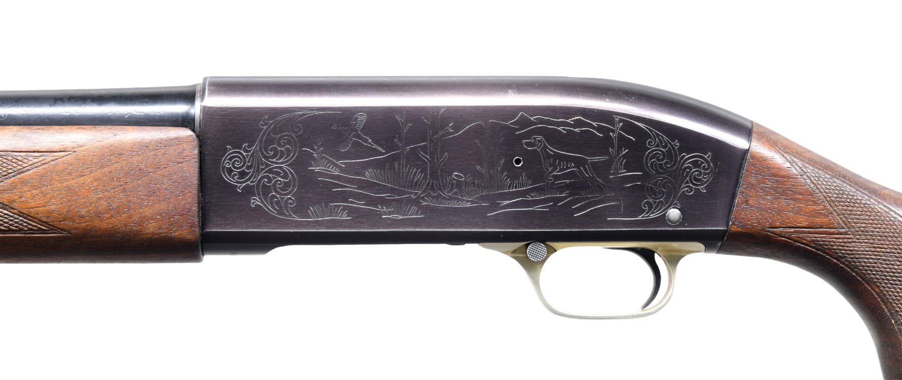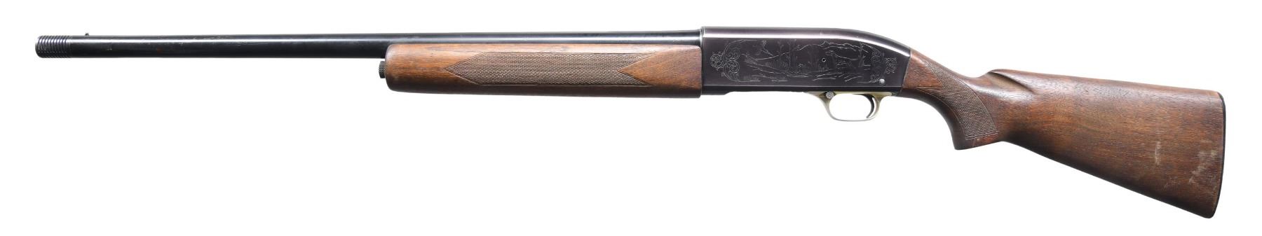 Cal. 12 ga. S# 24349. Bbl. 26", fiberglass-wrapped, with Versalite interchangeable chokes; Mod tube included. Black anodized alloy action with gold anodized trigger guard. Sides of the receiver have a game scene ornamentation featuring mallards on the right side with a pointer and flushing pheasant on the left. Forearm and pistol grip walnut stock with hand-checkering and original buttplate. Total of 82,085 mfg. 1960-1965. CONDITION: receiver is cracked at the bottom of the receiver, forward of the loading port; the gun is NOT safe to shoot. Bbl. retains 70% of the painted finish, showing scratches and marks. Action retains a 70% lightly faded finish. Refinished stocks have a dark appearance with worn checkering. The forearm has a 2" crack extending from the action. Very good, bright bore. (24-2747/DS). CURIO. $100-200.