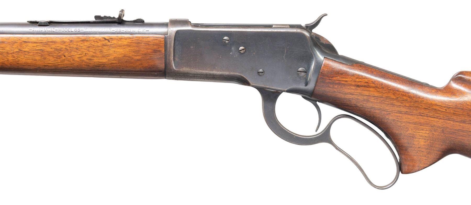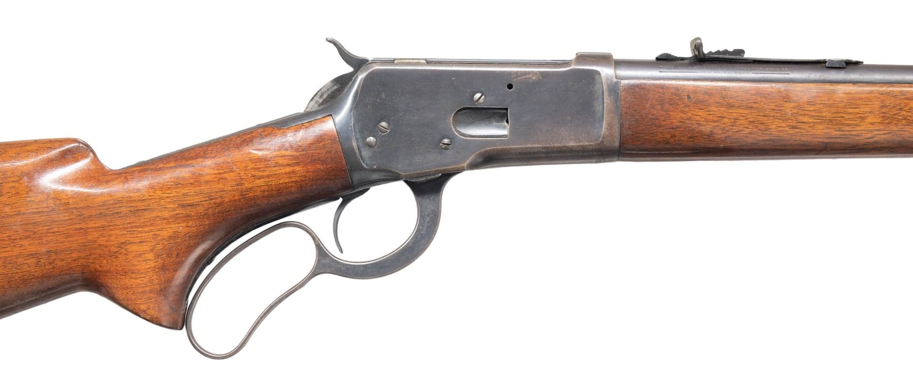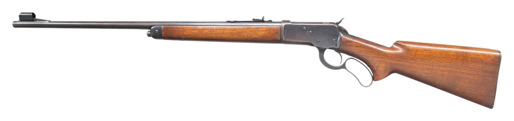 Cal. 25-20 WCF. S# 1007271. Bbl. 22" with hooded stippled ramp beaded front sight. Elevator adjustable sporting rear sight. Uncheckered pistol grip walnut stock set with checkered steel shotgun buttplate and screw fastened forearm cap. CONDITION: overall decent example with thinning original finish on the bbl with approx 70% coverage and scattered mild handling marks. Receiver finish coverage is approx 65% with carry wear on the top, bottom and high edges. There are some areas of freckled oxidation present and a a patch of red oxidation on the hammer and locking bolt. Expertly refinished stock set has some scattered handling marks and a small pencil lead sized chip at the butt. Bright bore with good sharp rifling. (25-1270/ZAL). CURIO. $1,200-1,800.