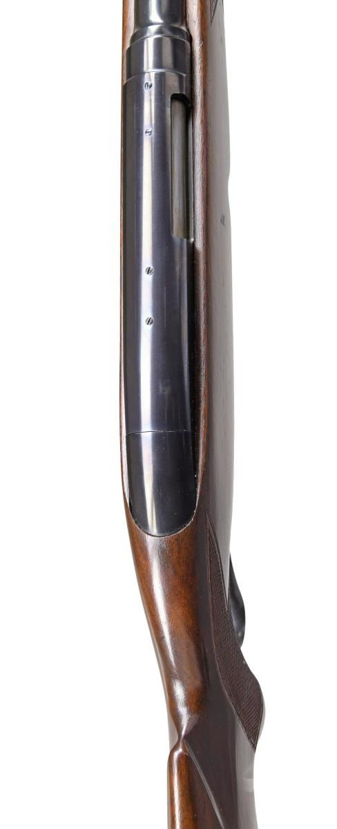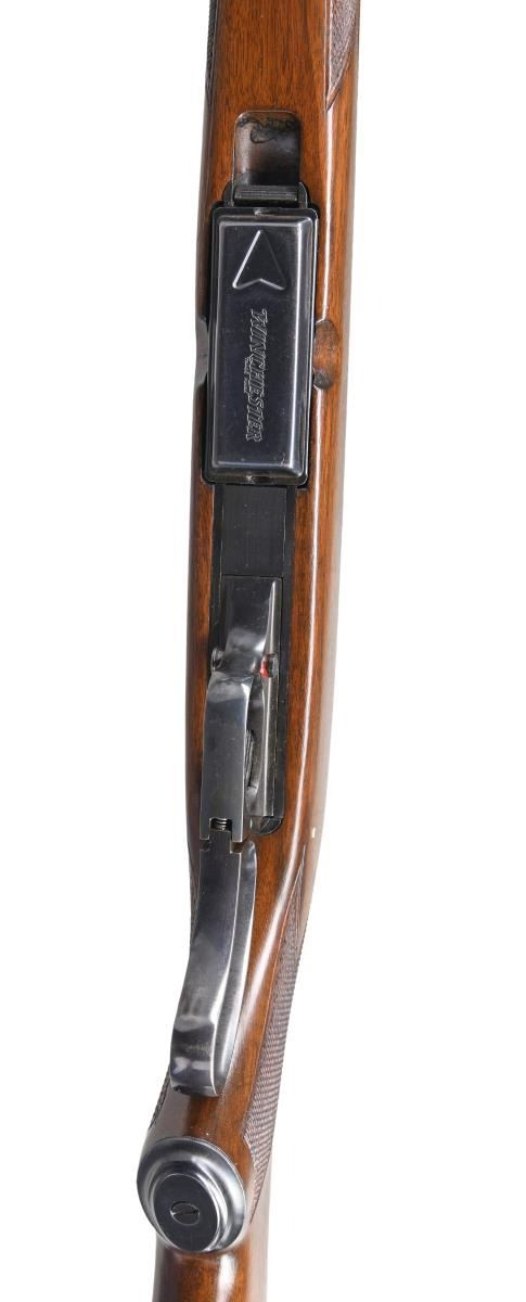 Cal. 358 Win. S# 96451. Bbl. 22" round. Ramp mounted hooded bead front sight w/ folding leaf rear sight. Blue finish. Walnut stock features hand checkering, steel grip cap, sling swivels & plastic buttplate. MAGS: 1 detachable 4 rd. Mfg. 1960. CONDITION: over 98% original blue. Very good original stock finish showing scattered scratches & marks. Bright near excellent bore. (24-1536/DS). CURIO. $2,500-3,500.