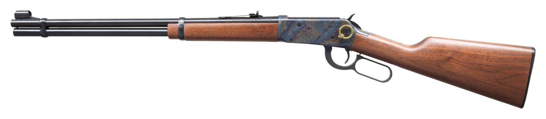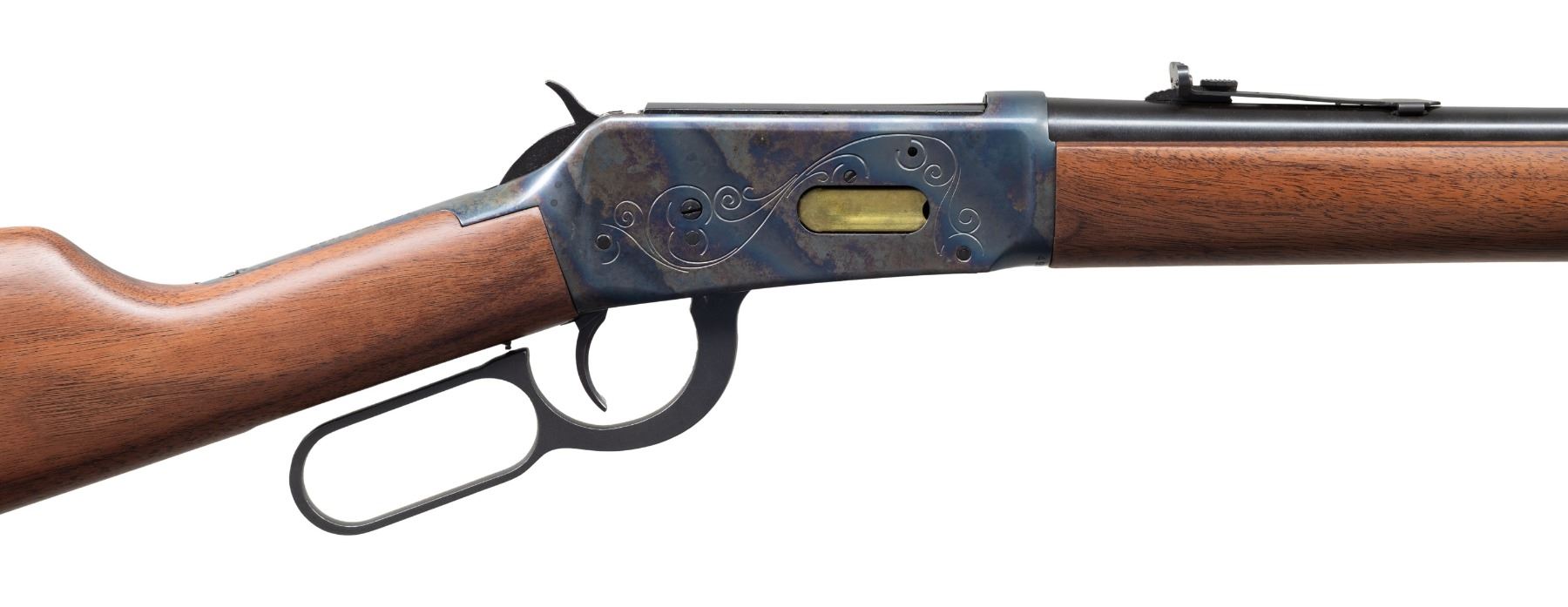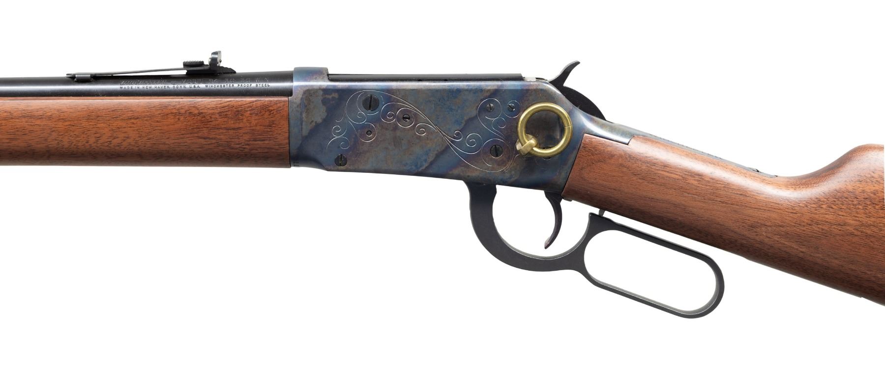 Cal. 30-30. S# 4995177. Bbl. 20". Hooded bead front sight. Adjustable sporting rear sight. Post-1964 made "Antique" 94 Winchester carbine with engraved case hardened receiver. Gold loading gate & saddle ring. Balance of other parts are blued. Walnut stock set. UNATTACHED ACCESSORIES: matching numbered factory box with manual. CONDITION: receiver & lever show some handling marks & light oxidation. Action functions properly when hand cycled. Other aspects near excellent. (24-2873/MJC). MODERN. $500-800.