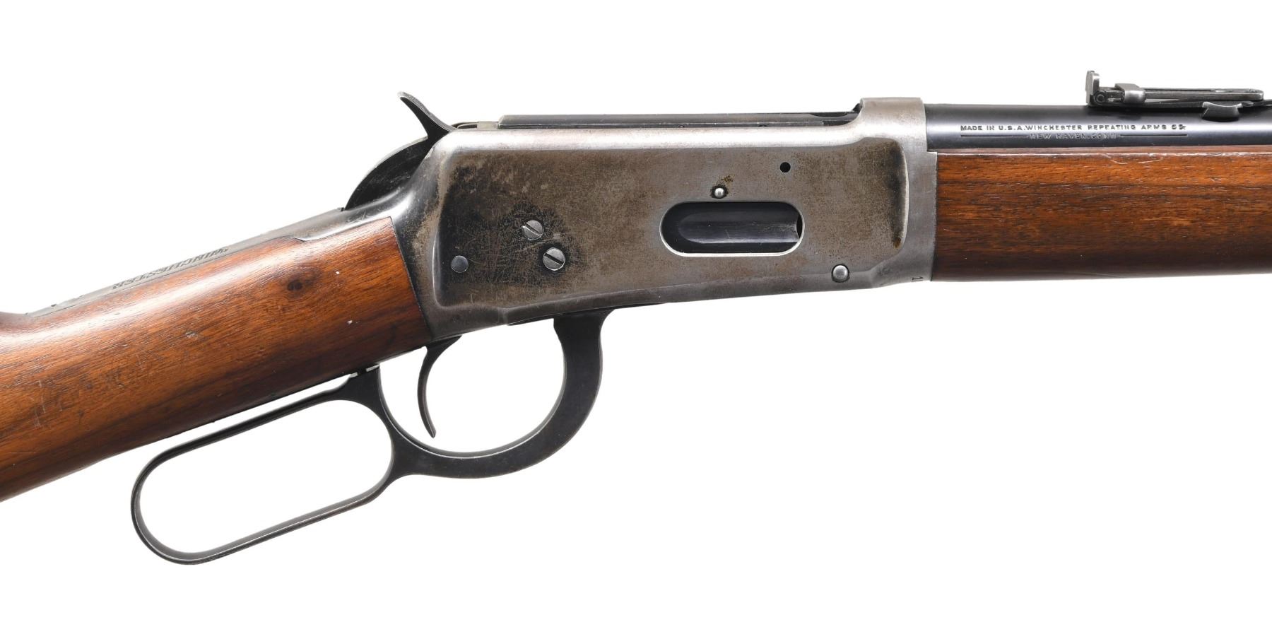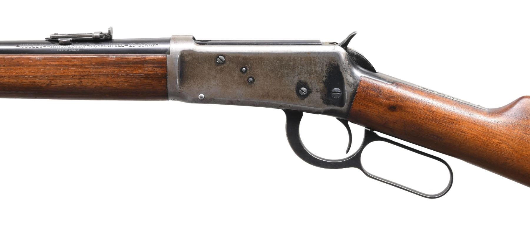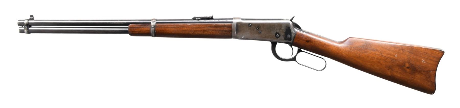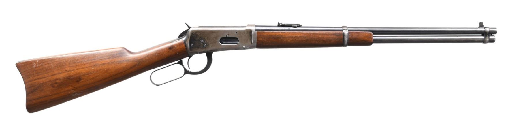 Cal. 25-35 WCF. S#. 1081095. Bbl. 20" w/ pinned blade front & carbine leaf rear sight. Full length mag. Blue finish. Eastern style carbine w/o saddle ring. Long wood forend & straight grip walnut stock w/ steel carbine buttplate. Mfg. 1930. CONDITION: 80% bbl. & mag. tube blue. Action has largely flaked to gray. Stocks show light wear w/ scattered scratches & marks. Very good bright bore. (24-5706/DS). CURIO. $1200-1800.