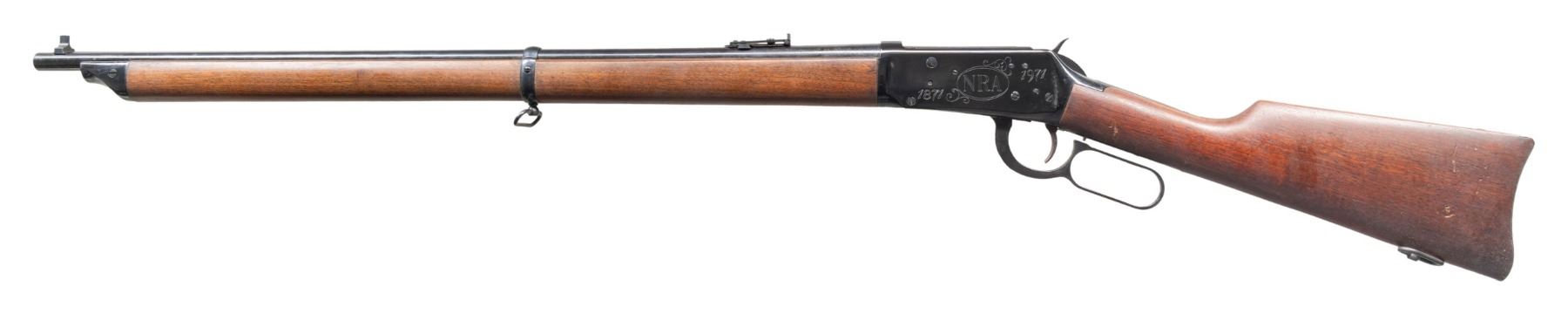 Cal. 30-30 Win. S#. NRA18323. Bbl. 26" rd with dovetailed high sporting style front sight and marked "NRA CENTENNIAL MUSKET". Sporting leaf style rear sight. Standard NRA Centennial engraved receiver. Blued finish. Full length musket stock with NRA Centennial medallion in the butt. CONDITION: overall fine with metal finishing showing only a few scattered handling marks and some minor freckling. Good stock set showing some dings and handling marks. Bright bore with sharp rifling. (25-1288/ZAL). CURIO. $400-600.