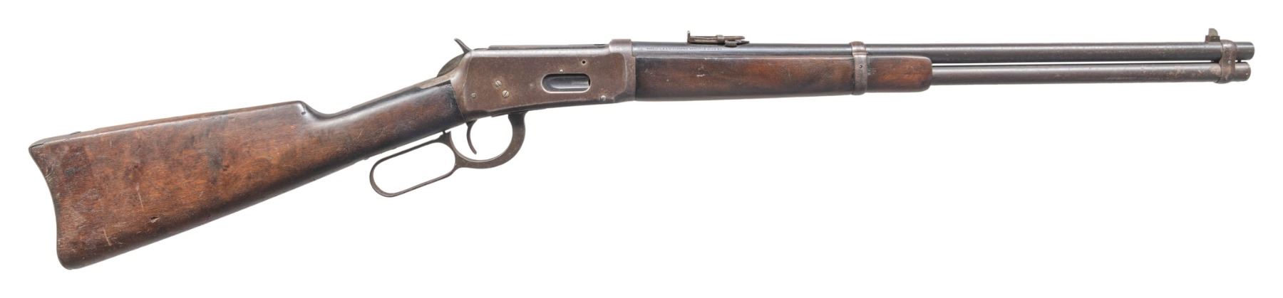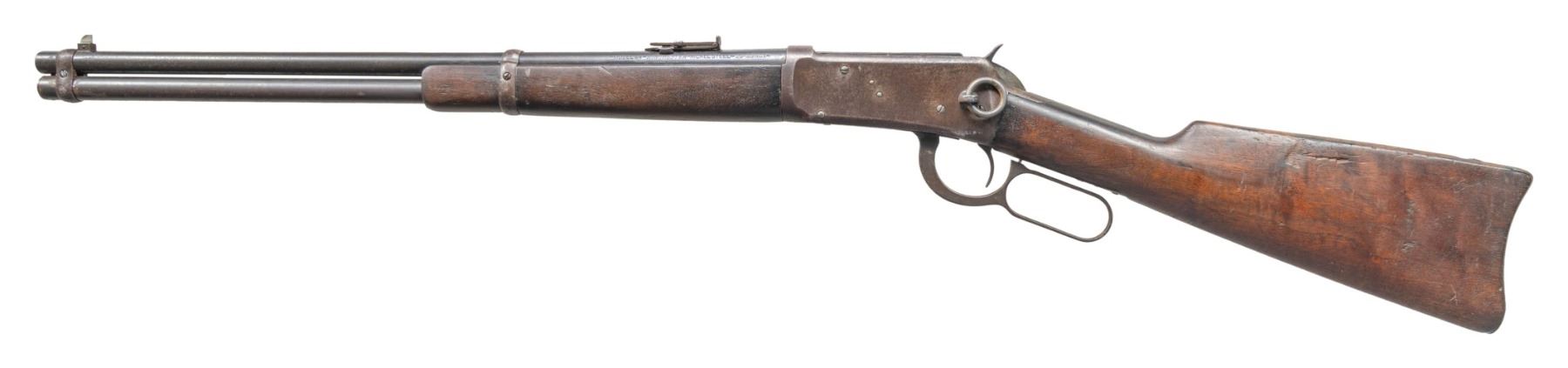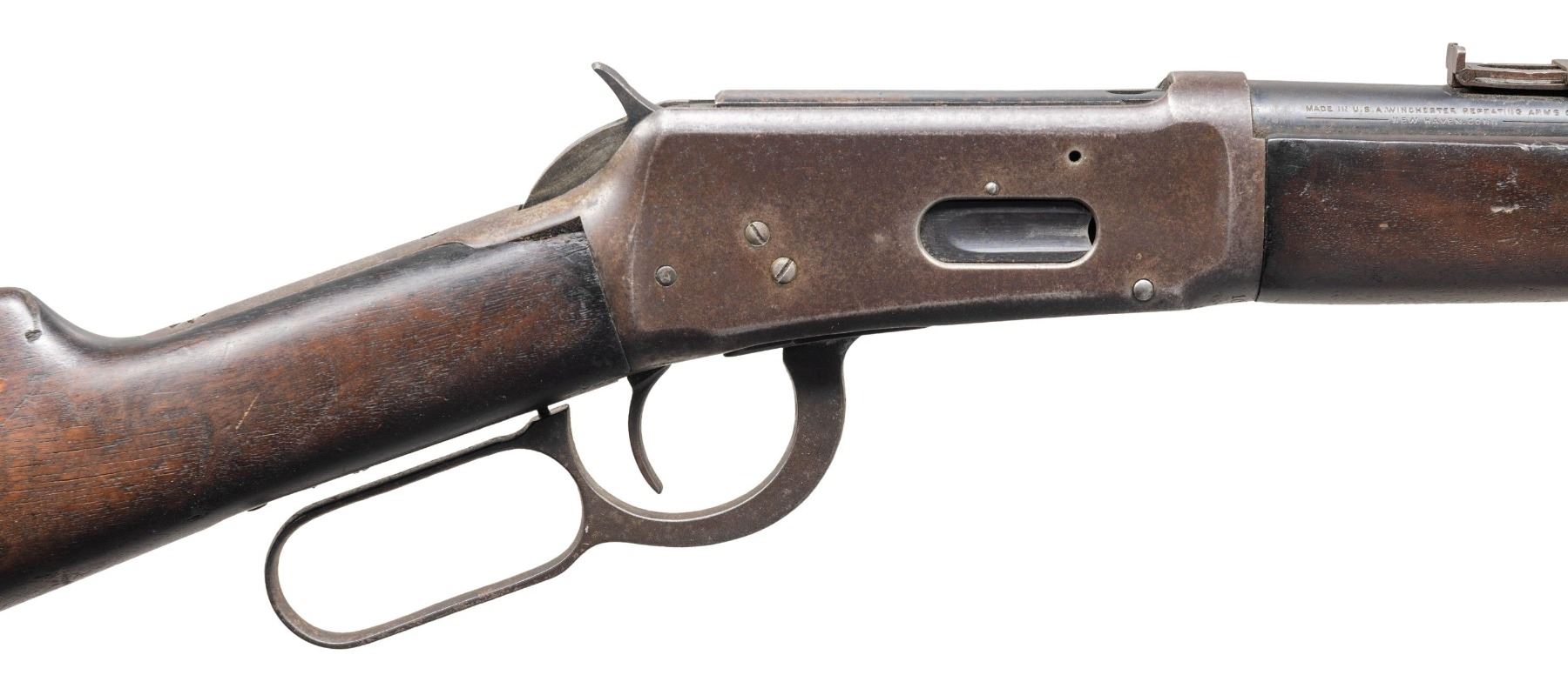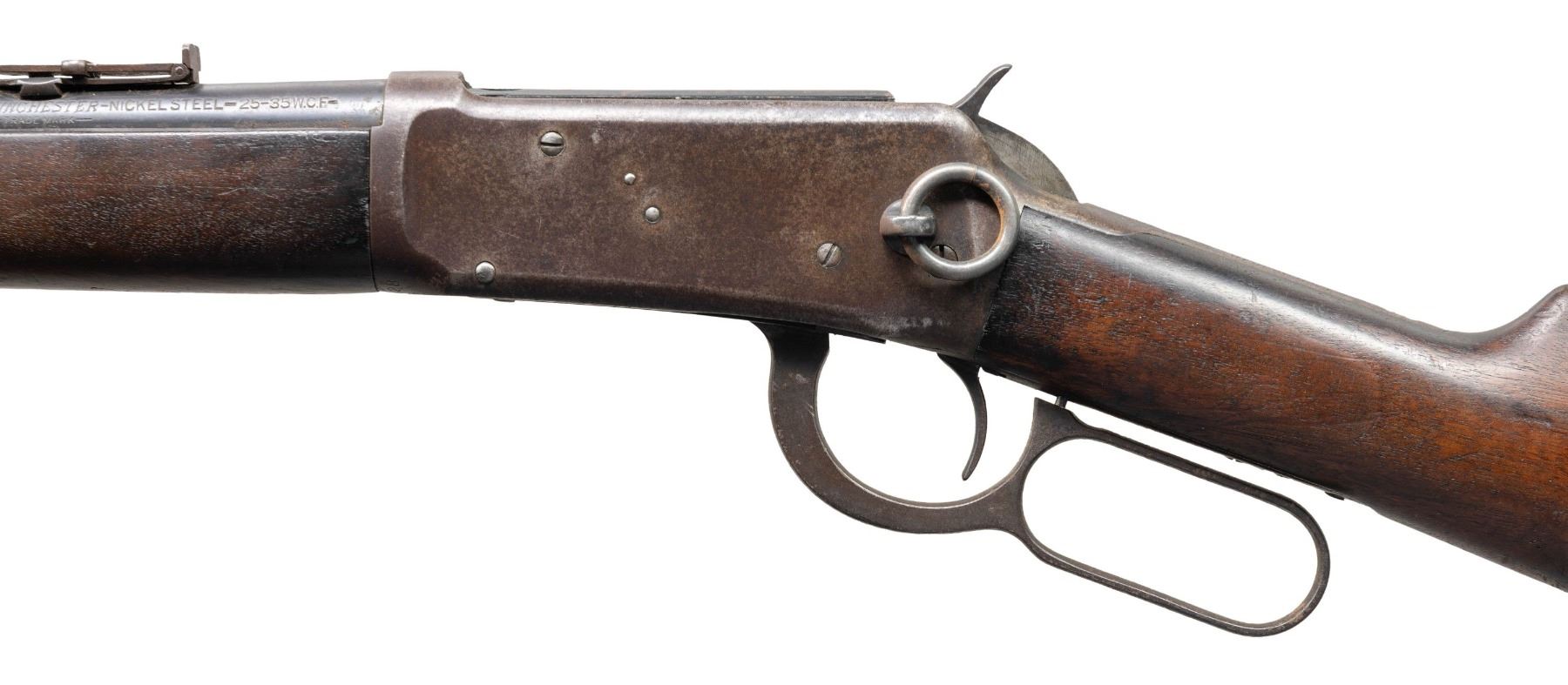 Cal. 25-35 WCF. S# 1080828. Mfg. 1932. Bbl. 20" rd with pinned silver blade carbine front sight. Carbine rear sight. "-Model 94- Winchester - / -Trademark - Nickel Steel - 25-35 W.C.F. -" & "Made in the U.S.A. Winchester Repeating Arms Co. - New Haven. Conn. - ". bbl markings. Plain trigger. Saddle ring. Straight grip walnut carbine stock set with smooth carbine butt plate. CONDITION: overall good. Bbl and mag tube finish have faded to approx a 30% coverage with the metal turning to a brown patina and exhibiting a scattered freckled old oxidation and mild handling marks. The receiver finish has faded with the metal showing a brown patina and freckled old oxidation with some minor handling marks as well. Stock set is fair with some scattered moderate handling marks,a chip in the wrist area, an open check crack at the upper butt plate tang and has been lightly sanded. Bore is lightly frosted with some mild pitting and sharp rifling. (25-1346/ZAL). CURIO. $900-1,400.